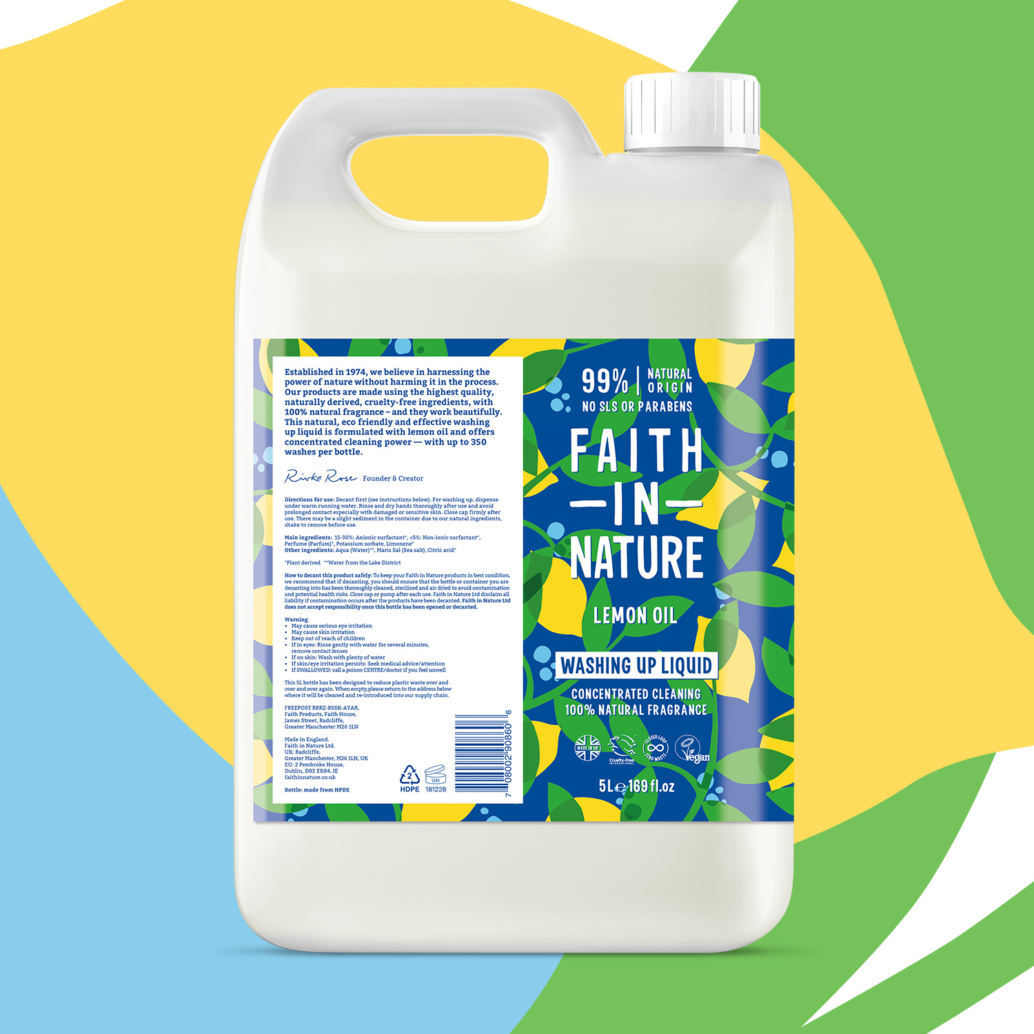 Faith in Nature afwasmiddel is zacht voor het milieu en irriteert de gevoelige huid niet. Het bevat een unieke formule op basis van plantaardige bestanddelen dewelke volledig biologisch afbreekbaar zijn voor een minimale impact op het milieu. Ook maakt Faith in Nature gebruik van recycleerbaar materiaal voor hun verpakking. Er werd geen gebruik gemaakt van kunstmatige kleurstoffen of schuimversterkers zodat de gevoelige huid gerespecteerd wordt. Wel is dit wasmiddel bijzonder hard voor vuil en vet en wast deze dan ook doeltreffend weg. Zijn geconcentreerde formule gaat ook langer mee.
