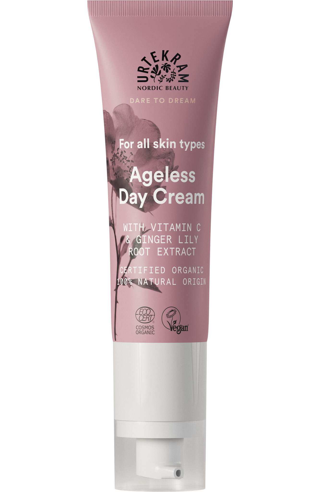 Urtekram Soft Wild Rose Dare to Dream Tijdloze Dagcrème met antioxidanten en vitamine C, die helpen beschermen tegen de eerste tekenen van veroudering. Een natuurlijke hydraterende en voedende anti-age dagcrème met rozenbottelolie en wit gemberleliewortelextract, die je huid helpt beschermen tegen vrije radicalen en milieu-invloeden. Hyaluronzuur helpt de elasticiteit van de huid te behouden en fijne lijntjes te verminderen. Bovendien zorgen aloë vera, jojoba-olie en amandelolie ervoor dat uw huid gehydrateerd blijft, nieuwe energie krijgt en een jeugdige uitstraling krijgt. Voor alle huidtypen.