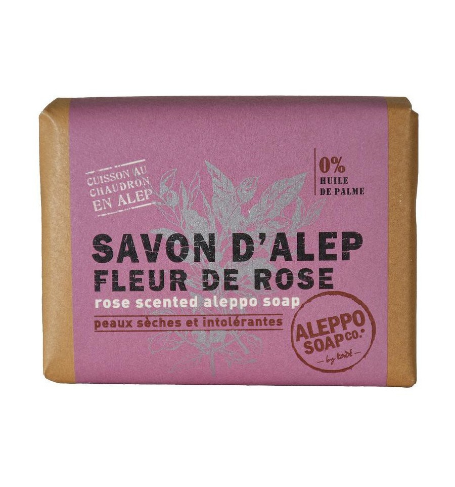 Handgemaakte Aleppo zeep op basis van pure olijfolie, verrijkt met laurierolie en subtiel geparfumeerd met de geur van de prachtige rozenbloem. De zeep reinigt ook de rijpe huid zonder deze te irriteren.