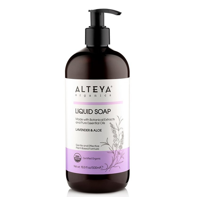 De Liquid Soap Lavender & Aloe van Alteya Organics is een milde, natuurlijke zeep voor lichaam en handen die de huid zacht reinigt zonder deze uit te drogen. De zeep bevat een biologische mix van hydraterende en huidverzorgende ingrediënten en aromatische etherische oliën. Deze vloeibare zeep geeft een rijk schuim en helpt bij het behoud van de natuurlijke vochtbalans van de huid. Na gebruik is de huid schoon, zacht en voelt deze prettig aan.