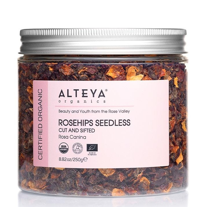 De Organic Dry Rose Hips Seedless - Cut and Sifted van Alteya Organics zijn biologische gedroogde rozenbottels die gesneden en gezeefd zijn. De vruchten worden met de hand geplukt uit de rozenbottelstruiken. In de lente verfraaien de struiken hun omgeving met hun zachte bloemen, terwijl ze ons in de herfst deze kleine rode vruchten geven, boordevol energie van de zomerzon en een combinatie van nuttige ingrediënten. Deze biologische rozenbottels zijn rechtstreeks afkomstig van Alteya's biologische boerderij in het hart van de Bulgaarse rozenvallei.