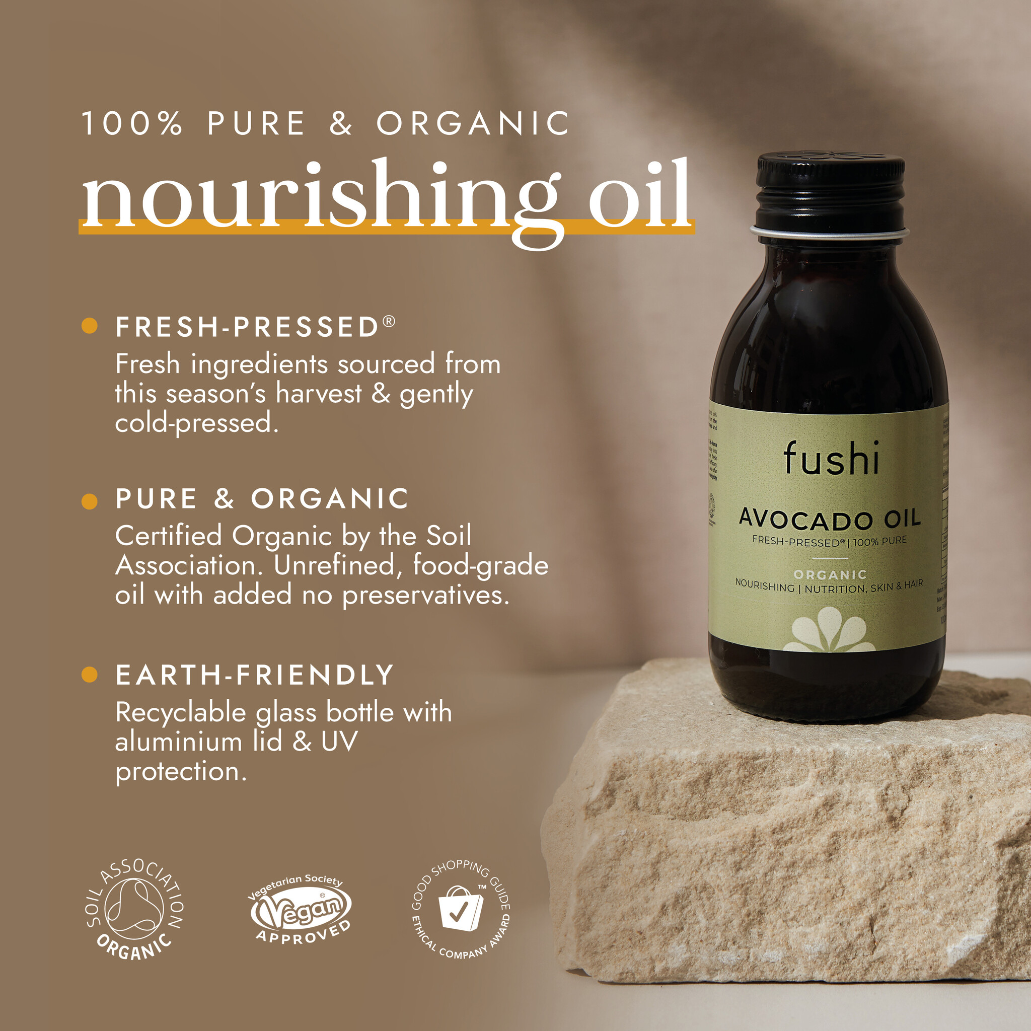 Fushi Organic Cold-Pressed Avocado Oil kalmeert een jeukende, schilferige huid