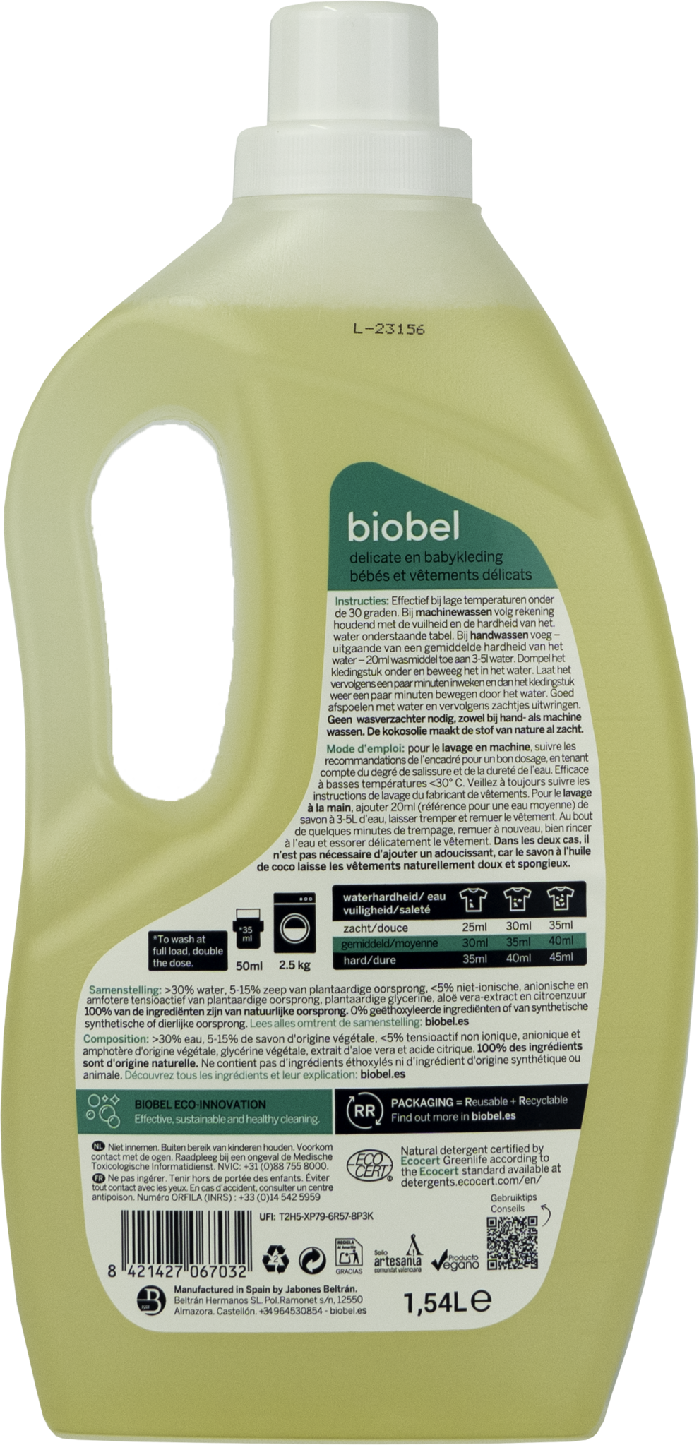 Dit ecologische wasmiddel op basis van authentieke natuurlijke kokosoliezeep is ideaal voor het wassen van alle soorten stof met de hand of in de machine. Door zijn indrukwekkende zachtheid is deze zeep sterk aanbevolen voor het wassen van kleding voor baby's, of volwassenen met een gevoelige huid, of mensen met atopische, prikkelbare of jeukende huidaandoeningen. Bovendien is ze efficiënt bij lage temperaturen.