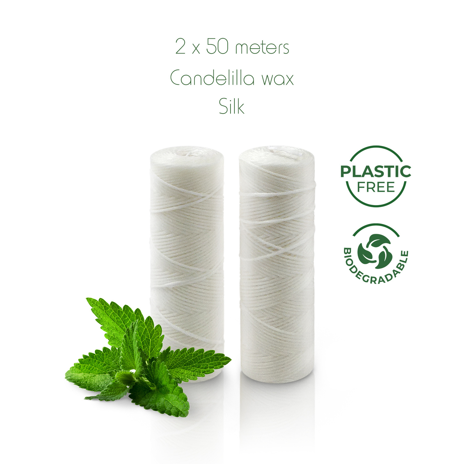 - Navulling: 2 rolletjes van 50 meter natuurlijk zijden flosdraad