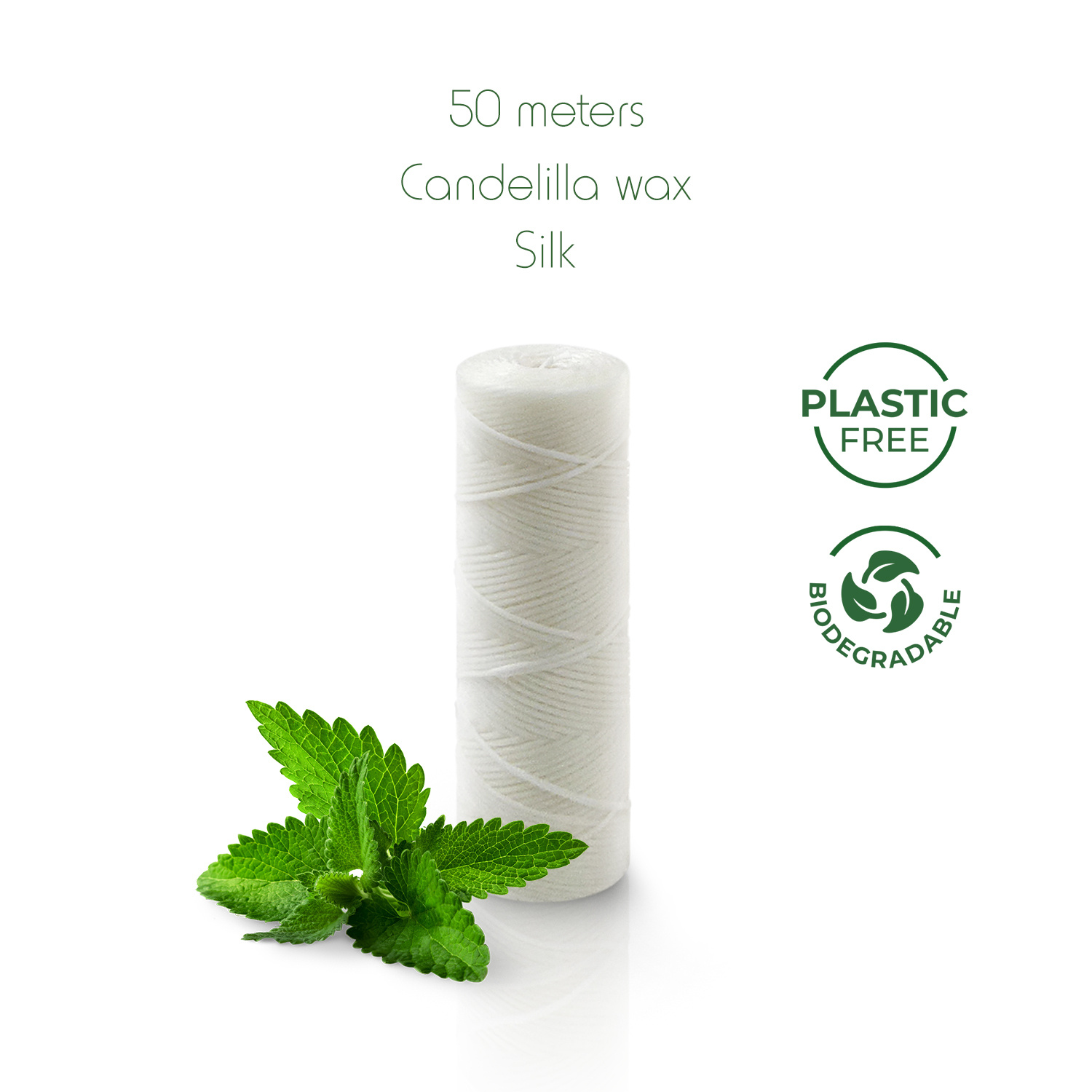 De 50 meter lange flosdraad is gemaakt van moerbeizijde met candelillawas en is verrijkt met een verfrissend vleugje pepermunt. 50 meter tandzijde is genoeg voor 200 flosbeurten.