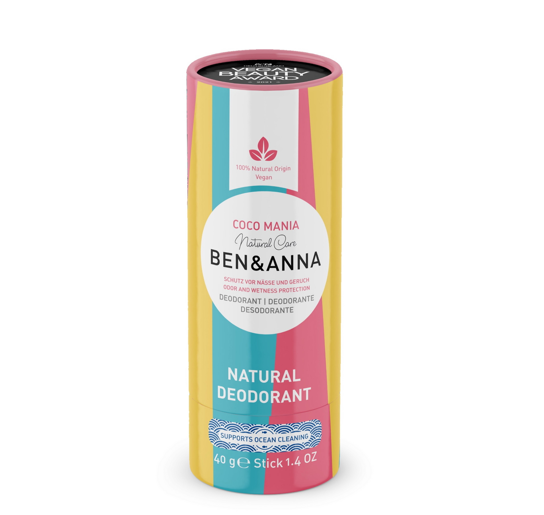 De Deodorant Stick Papertube Coco Mania van BEN&ANNA is een natuurlijke deodorant die je op betrouwbare wijze beschermt voor onaangename geuren. De doeltreffendheid van zuiveringszout vermindert op natuurlijke wijze geurvormende bacteriën. Voedende sheabutter en plantaardige oliën verzorgen de huid en zorgen voor een romige consistentie die niet afbrokkelt en niet vet of plakkerig is. Dankzij de volledig duurzame en recyclebare verpakking is deze deodorant niet alleen een veganistisch en natuurlijk alternatief voor conventionele deodorantsticks, maar ook een plasticvrij alternatief. 100% vegan en glutenvrij.