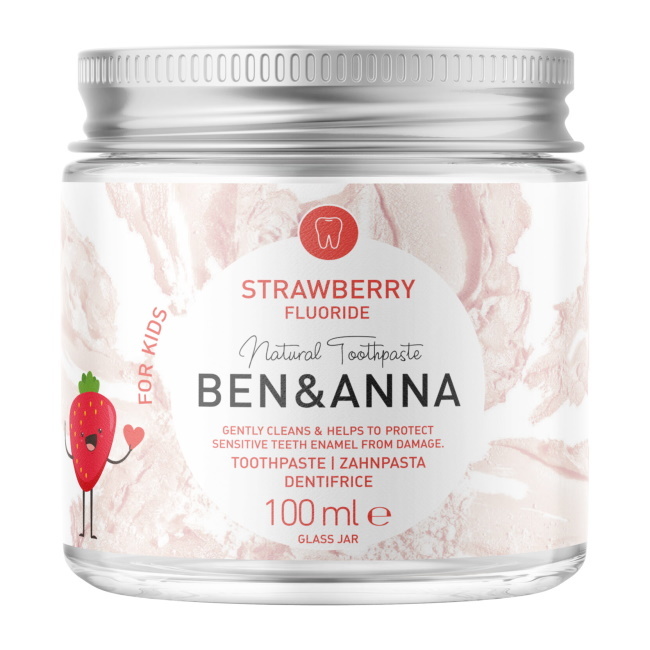 De Kids Toothpaste Strawberry with Fluoride van BEN&ANNA is een natuurlijke kindertandpasta die de tanden reinigt en beschermt. Kiezelzuur reinigt de tanden zacht en grondig. Xylitol gaat de opbouw van plaque tegen, waardoor je minder kans hebt op tandsteen, gaatjes en andere tandproblemen. Bovendien versterkt het de tanden en wordt het tandglazuur minder kwetsbaar. Aloë vera sap kalmeert, herstelt en zorgt voor een gezond tandvlees. De Toothpaste Orange with Fluoride bevat een fluoride-gehalte dat aangepast is op de behoefte van kinderen (500ppm) en heeft een fruitig-frisse aardbeiensmaak. De verpakking is van glas en dus plasticvrij.