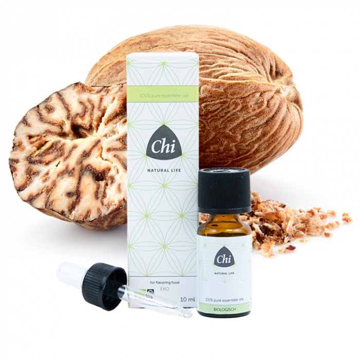 De Biologische Etherische Nootmuskaat Olie van Chi is een 100% biologische en zuivere etherische nootmuskaat olie. De olie wordt gewonnen via stoomdestillatie van de zaden. Nootmuskaatolie heeft een aantrekkelijke, typische geur die omschreven kan worden als kruidig, scherp, aromatisch, licht bitter en warm. De olie is kleurloos tot lichtgeel van kleur. Deze biologische etherische olie is bijzonder geschikt voor gebruik in de keuken.