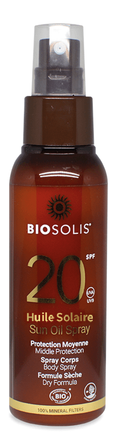 De Sun Oil Spray SPF20 van Biosolis is een natuurlijke zonnebrandolie die een geheel natuurlijke bescherming biedt voor lichaam en haar. Een combinatie van verzorging en bescherming met minerale filters en plantenoliën. Minerale filters zorgen voor een breedspectrum bescherming tegen UVA- en UVB-straling. Sesamolie bevat een hoog gehalte aan fytosterolen die de huidbarrière regenereren. Bovendien voedt en hydrateert het de huid en verzacht het irritaties. Karanja olie werkt beschermend, zorgt voor een stevige, soepele huid en brengt de huid in balans. Bevat verder o.a. abrikozenpitolie en olijfolie. De zijdezachte textuur is aangenaam, smeert gemakkelijk uit en plakt niet.