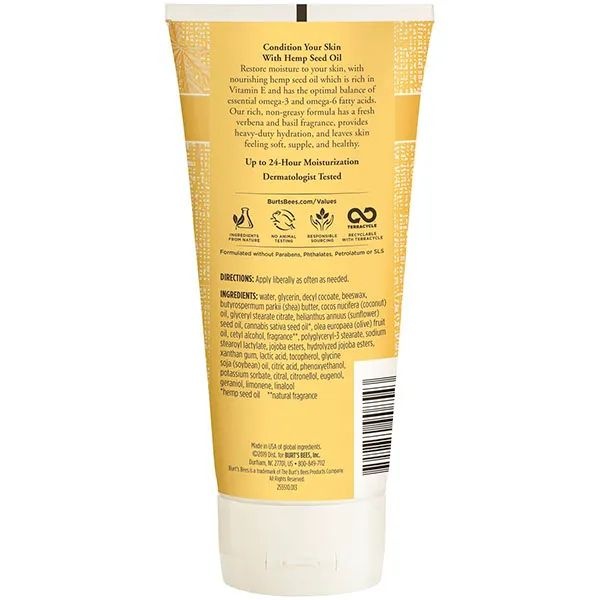 Burt´s Bees Body Lotion Hemp hydrateert de huid en herstelt het vochtgehalte gedurende 24 uur met voedende hennepzaadolie. De krachtige hydratatie laat de huid zacht, soepel en gezond aanvoelen. Deze rijke, luchtige formule heeft de frisse geur van verbena en basilicum.