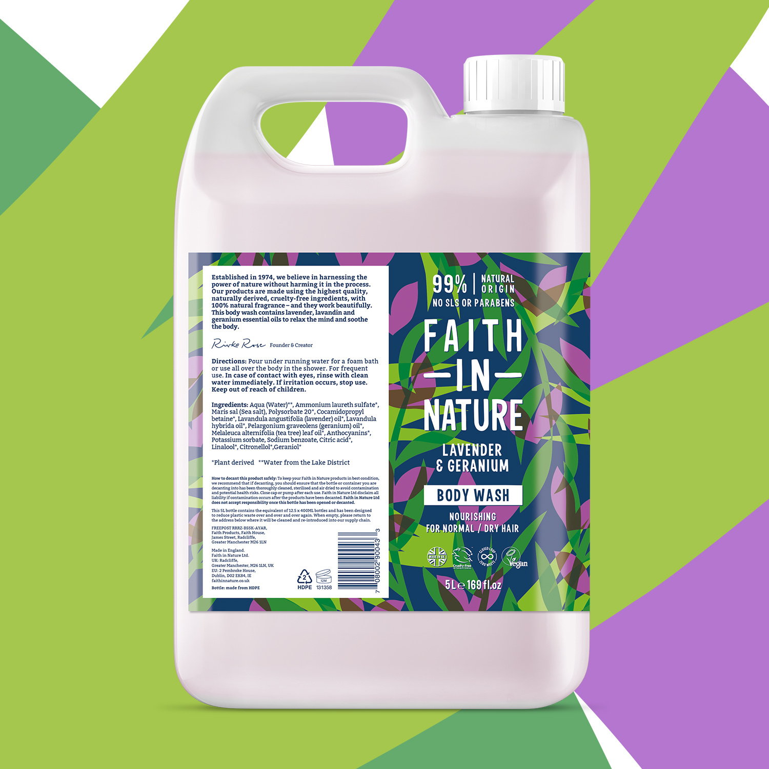 Faith in Nature Lavendel & Geranium douchegel is een kalmerende en relaxerende douchegel die je even doet ontspannen onder de douche of in bad. Dit product maakt deel uit van Faith in Nature’s award winning reeks. Er werd gebruikt gemaakt van Faith in Nature’s eigen aromatherapie oliën die speciaal ontwikkeld zijn om stress tegen te gaan en de huid diepgaand te voeden. Dit steeds met respect voor de natuur. Neem dus gauw een heerlijk ontspannend bad en geniet van het kalmerende effect van pure lavendel en geranium, zowel op je huid als op je zintuigen.