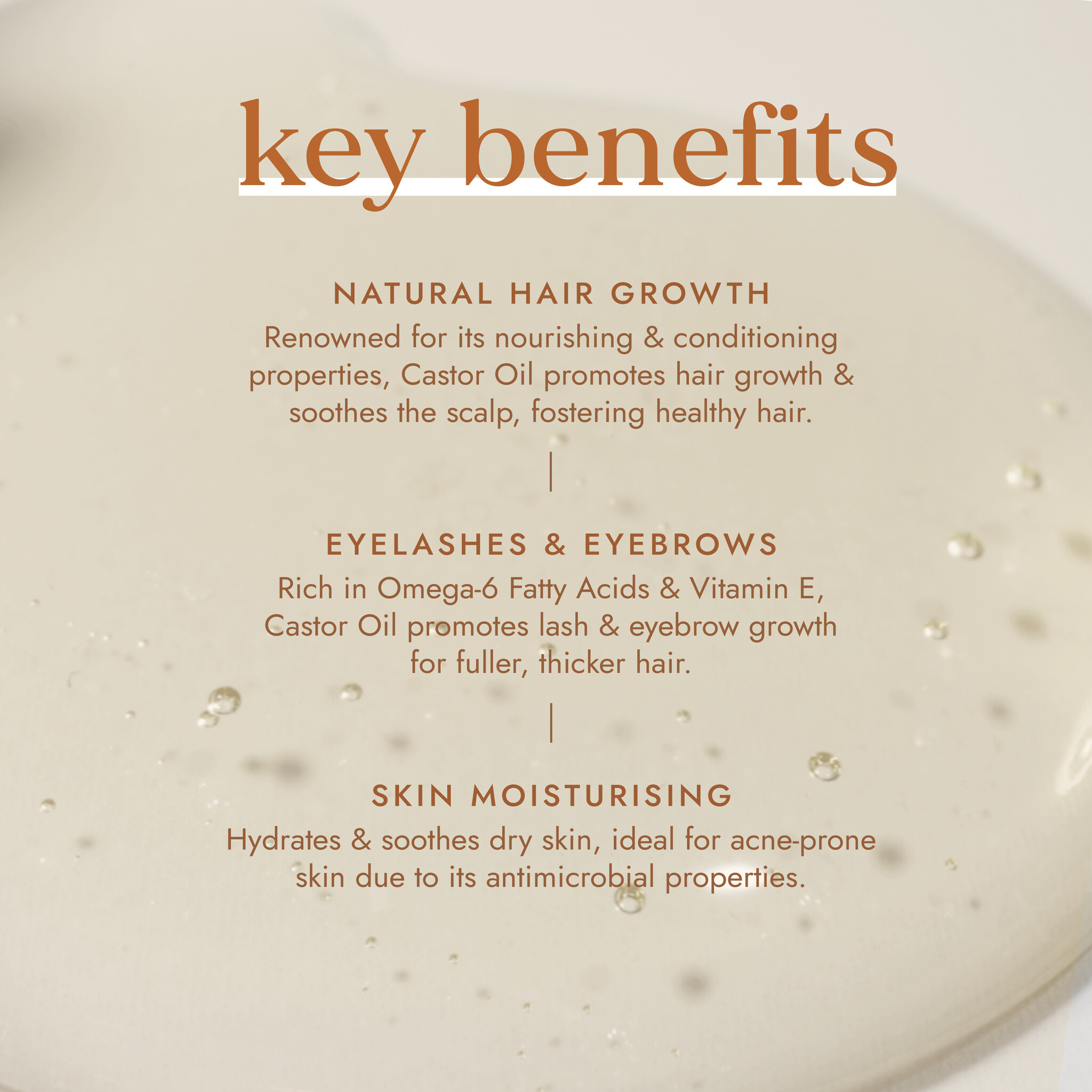 Dankzij het triglyceridegehalte is castorolie voedend, verzachtend en hydraterend voor de droge huid. Het is ook geweldig voor de acnegevoelige huid, dankzij de antimicrobiële eigenschappen.