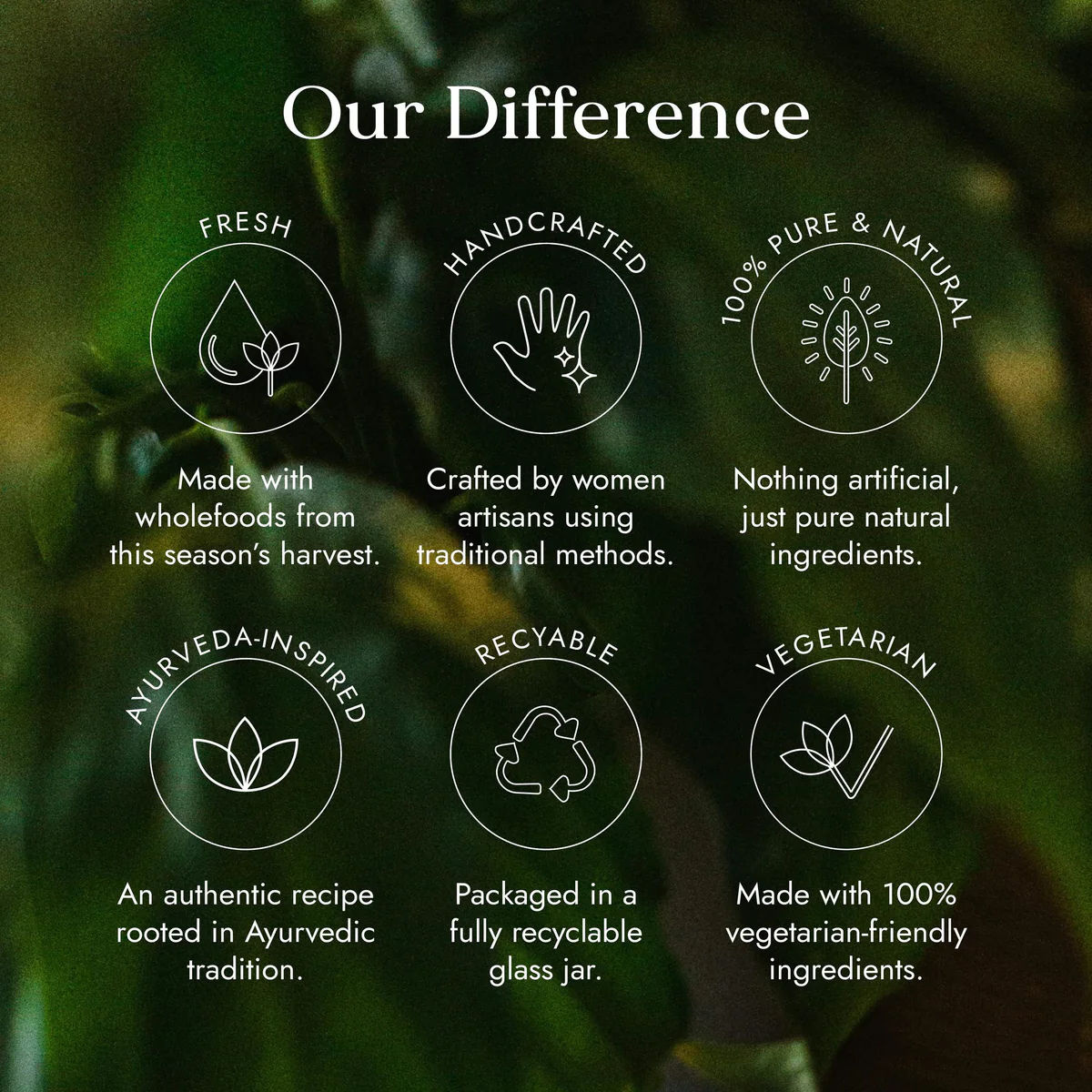 Een mix van 30 verse Ayurvedische kruiden en Chyawanprash-ingrediënten – dit is 's werelds originele adaptogeen, dat rust, energie en innerlijke kracht ondersteunt.