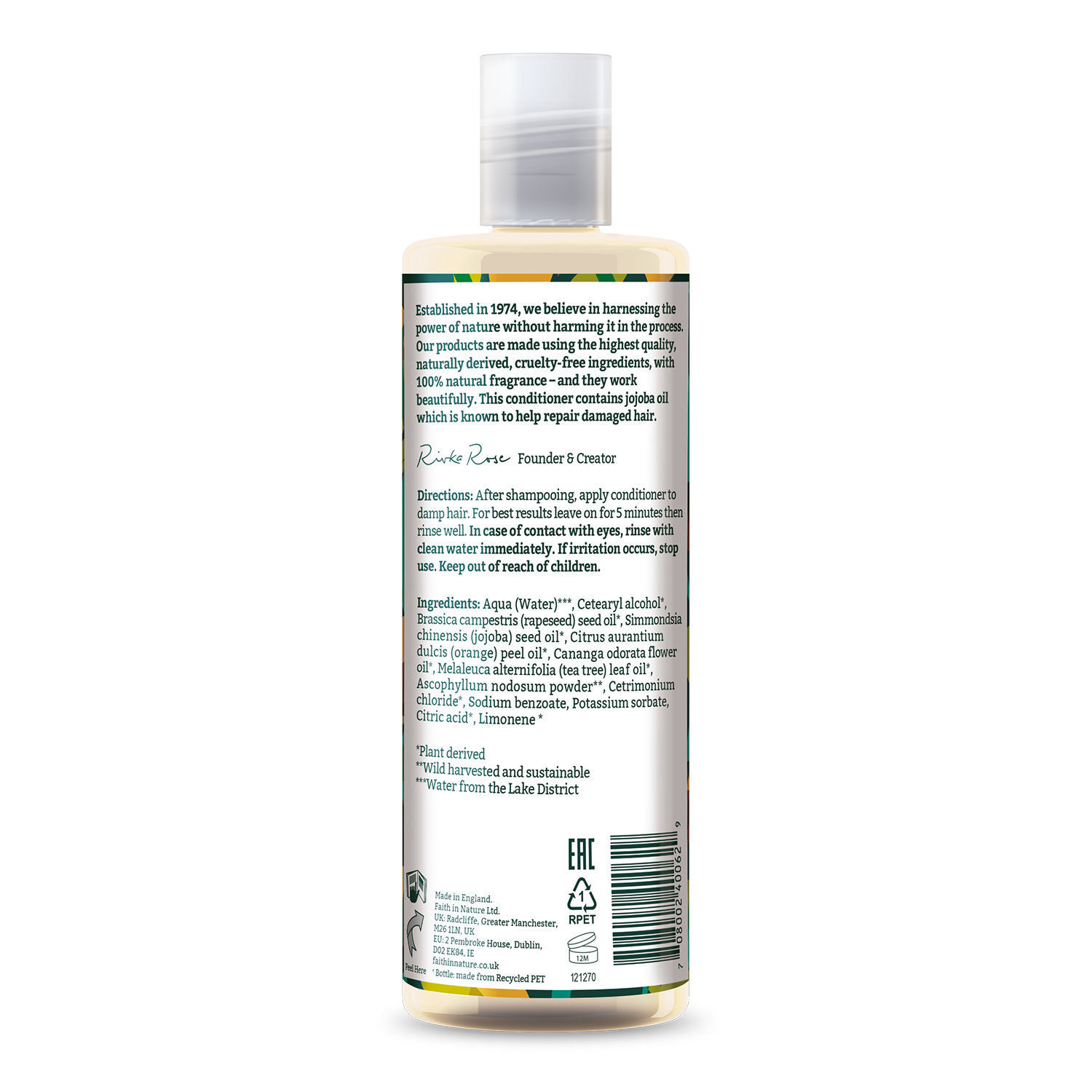 Ingrediënten: Aqua (Water)***, Cetearyl alcohol*, Brassica campestris (rapeseed) seed oil*, Simmondsia chinensis (jojoba) seed oil*, Citrus aurantium dulcis (orange) peel oil*, Cananga odorata flower oil*, Melaleuca alternifolia (tea tree) leaf oil*, Ascophyllum nodosum powder**, Cetrimonium chloride*, Sodium benzoate, Potassium sorbate, Citric acid*, Limonene *