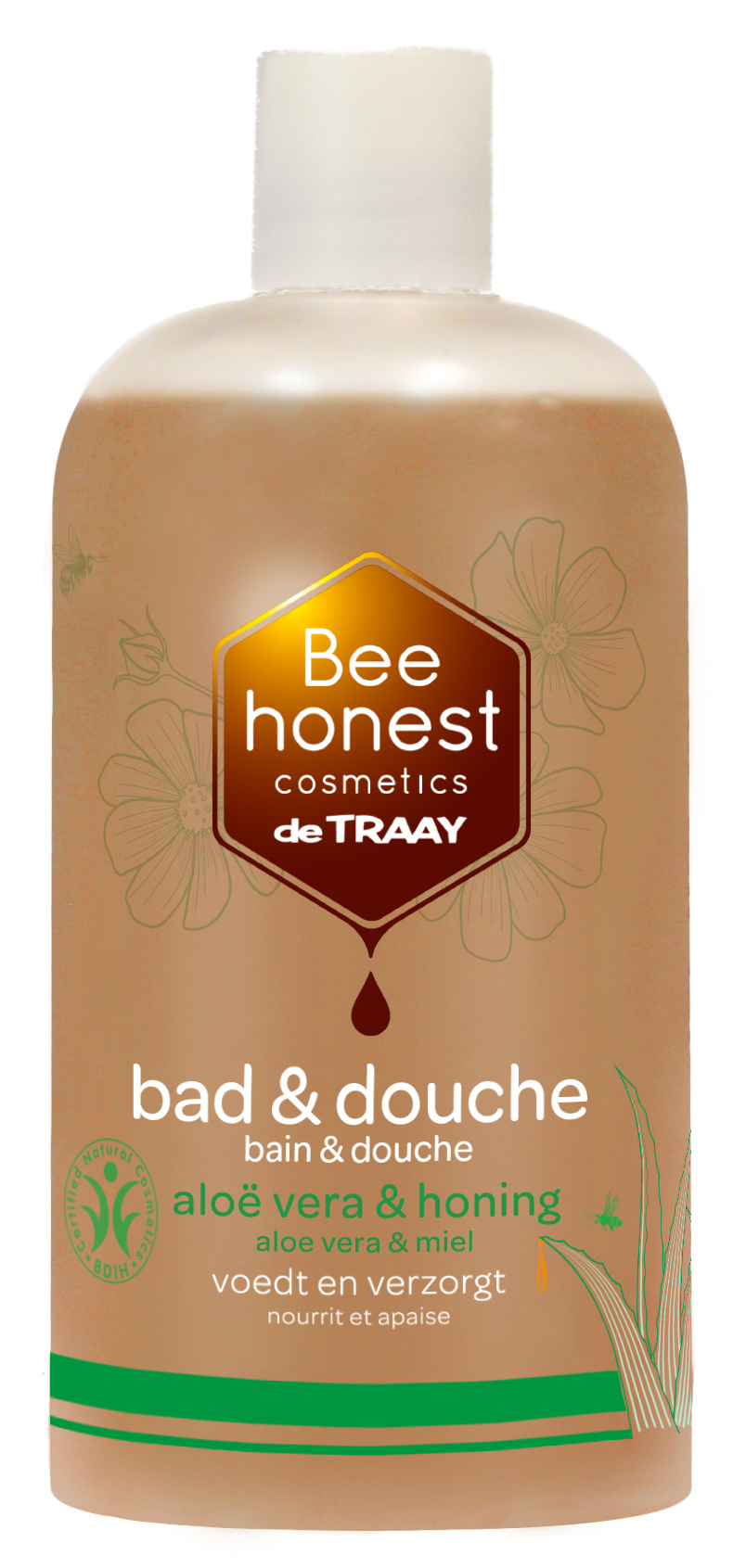 De Bad & Douche Aloë Vera & Honing van Bee Honest Cosmetics combineert een milde reiniging met natuurlijke actieve ingrediënten. Milde tensiden zorgen voor een zachte reiniging. Biologisch aloë vera sap hydrateert, verzacht en voorkomt dat de huid uitdroogt. Biologisch honingextract van De Traay voedt en verzacht. Geschikt voor alle huidtypen. De Bad & Douche Aloë Vera & Honing heeft een subtiele honinggeur.