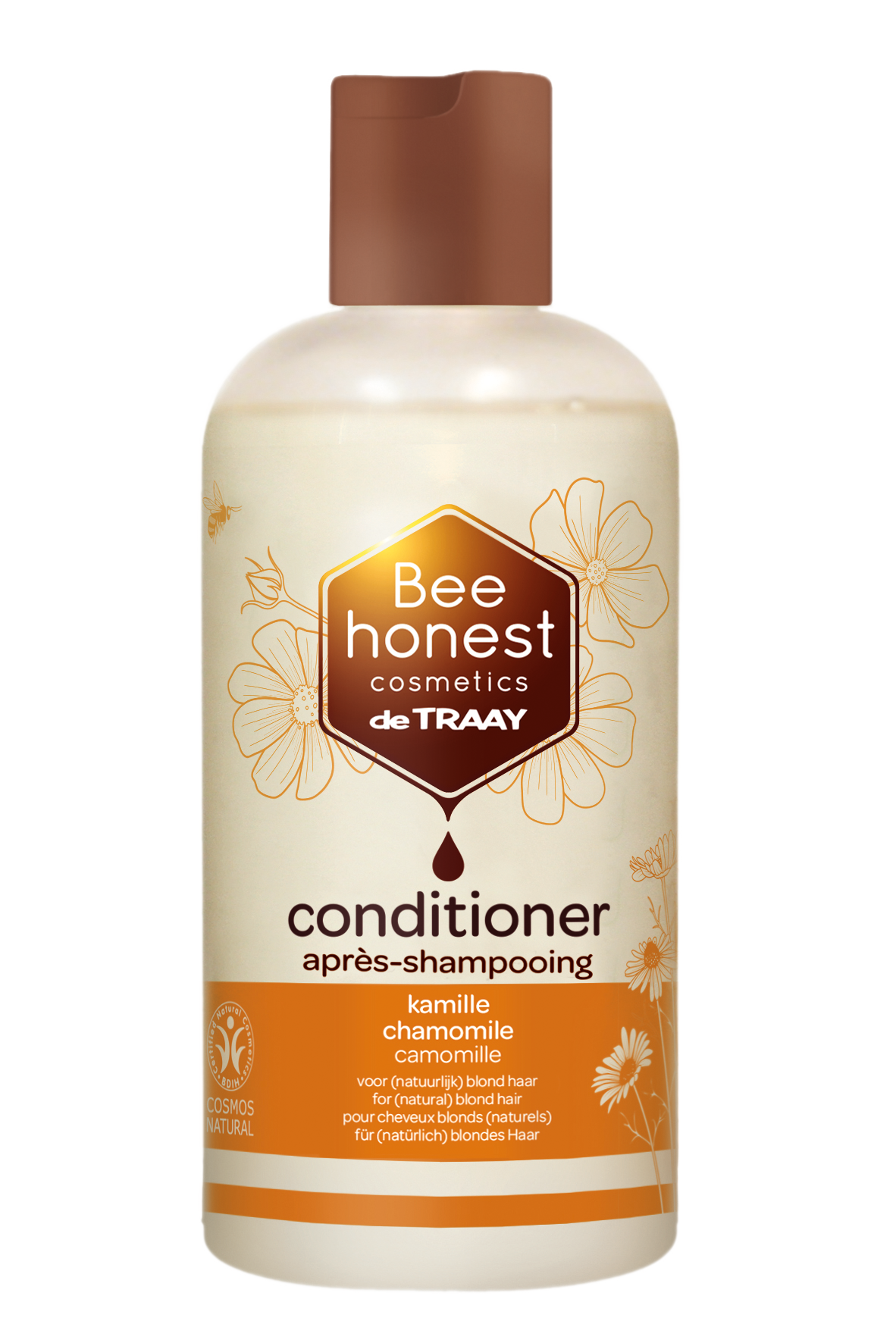 De Conditioner Kamille van Bee Honest Cosmetics is een verzorgende conditioner voor blond en geblondeerd haar. Meadowfoamolie herstelt, hydrateert en maakt het haar zijdezacht. Zonnebloemolie hydrateert, beschermt en voorkomt droog, broos en pluizend haar. Biologische honing van De Traay zorgt voor een gezonde hoofdhuid en voedt, hydrateert en verzacht het haar. Biologisch kamille extract verheldert blond en geblondeerd haar op natuurlijke wijze. De Conditioner Kamille heeft een zachte geur van kamille.