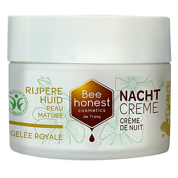 De Nachtcrème Gelee Royale van Bee Honest Cosmetics verzorgt en ondersteunt de huid 's nachts bij het huidherstel. Zonnebloemolie hydrateert, verzacht en versterkt de huidbarrière. Jojoba olie hydrateert de huid intensief, vermindert ontstekingen en verbetert de huidelasticiteit. Squalaan helpt vocht vast te houden en houdt de huid zacht en soepel. Gelee royale (ook wel royal jelly of koninginnengelei genoemd) is rijk aan vitamines, mineralen, enzymen en aminozuren. Het stimuleert de celvernieuwing, verstevigt de huid en bevordert de doorbloeding. Sheabutter verzacht, versterkt de huidbarrière, voorkomt vochtverlies, hydrateert en voedt. Zoethoutwortelextract werkt kalmerend, ontstekingsremmend en antibacterieel. Bevat verder o.a. sesamolie, vitamine E en hyaluronzuur.
