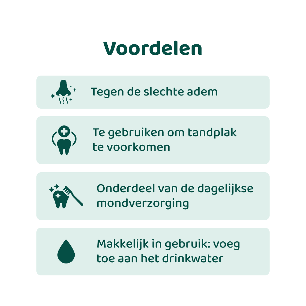 De actieve ingrediënten verbeteren de conditie van het tandvlees en helpen tegen een slechte adem. Doordat je hond het tijdens het drinken binnenkrijgt, werkt het continu aan een frisse adem en een schoon gebit. Dit maakt het een moeiteloze en effectieve manier om de mondhygiëne van je hond te verbeteren.