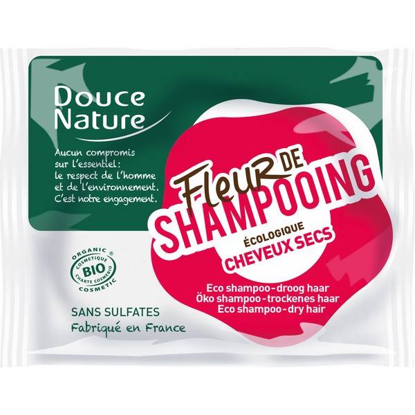 De Vaste Shampoo DroogHaar van Douce Nature is een natuurlijke shampoo bar in een unieke bloemvorm, vandaar de naam Franse naam Fleur de Shampooing. De shampoo geeft een fijn, delicaat schuim en bevat milde tensiden voor een zachte reiniging. Rode klei is rijk aan mineralen en versterkt, verzacht en zuivert de hoofdhuid. Biologische sheabutter voedt, beschermt en herstelt het haar. Biologische argan olie verbetert de vochtbalans van de hoofdhuid en zorgt voor soepel, zacht haar. Een stuk vaste shampoo staat gelijk aan een fles van 400ml shampoo. De Vaste Shampoo Droog Haar is vrij van sulfaten.