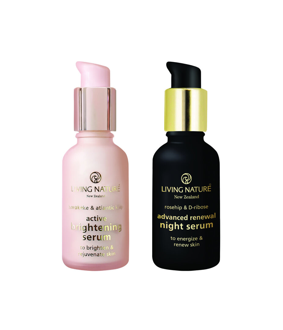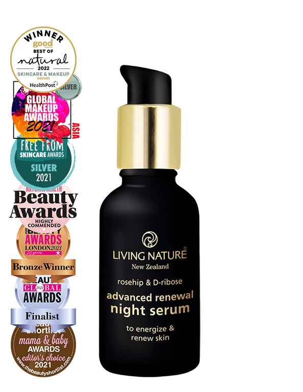 Advanced renewal night serum: Aqua (water), Cocos nucifera (coconut) oil**, Pentylene glycol (vegetable), Jojoba esters, Glycerin**, Cetearyl olivate, Galactoarabinan, Sorbitan olivate, Ribose, Mel (manuka honey)**, Sodium hyaluronate, Rosa canina (rosehip) fruit oil**, Salicylic acid, Aloe barbadensis leaf juice powder**, Xanthan gum, Tocopherol, Sodium phytate, Parfum*, Mica CI 77019, Titanium dioxide CI 77891, CI 77492.