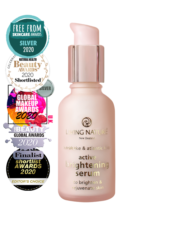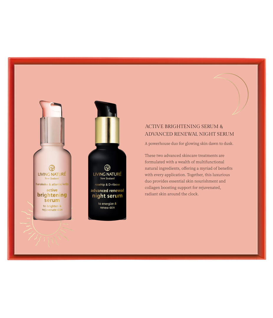 Active brightening serum: Aqua (water), Glycerin**, Pentylene glycol (vegetable), Pentaclethra macroloba (pracaxi fruit) seed oil**, Cocos nucifera oil**, Isoamyl laurate, Cetearyl olivate, Galactoarabinan, Sorbitan olivate, Phormium tenax (harakeke) extract, Ascophyllum nodosum (atlantic kelp) extract, Xanthan gum, Sodium hyaluronate, Rosa canina (rosehip) fruit oil**, Aloe barbadensis leaf juice powder**, Tocopherol, Salicylic acid, Sodium phytate, Parfum*.
