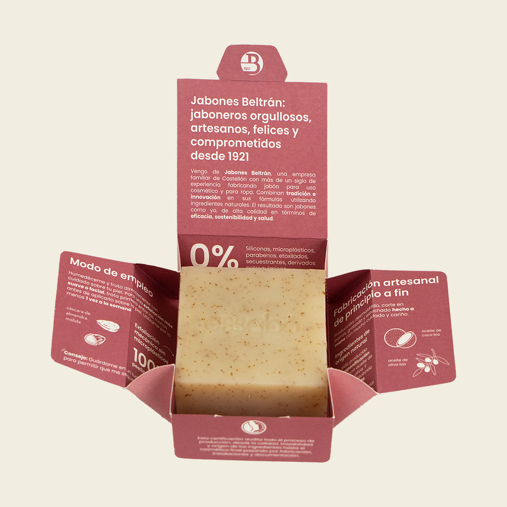 Essabó Exfoliante is dankzij de gemalen amandelschil een ideale zeep om de huid subtiel te reinigen en te exfoliëren in hetzelfde gebaar. Een goede exfoliatie van tijd tot tijd verwijdert onzuiverheden, dode huidcellen en stimuleert celvernieuwing.