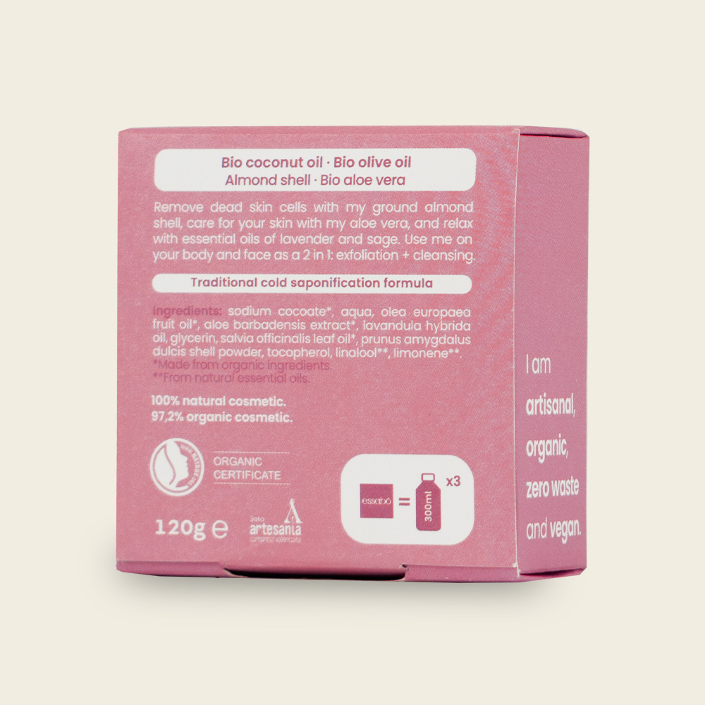 Essabó Exfoliante is een shower bar die is ontwikkeld om de huid zacht en natuurlijk te exfoliëren, dankzij gemalen amandelschil en biologische aloë vera . De basis is gemaakt met biologische kokosolie en olijfolie.