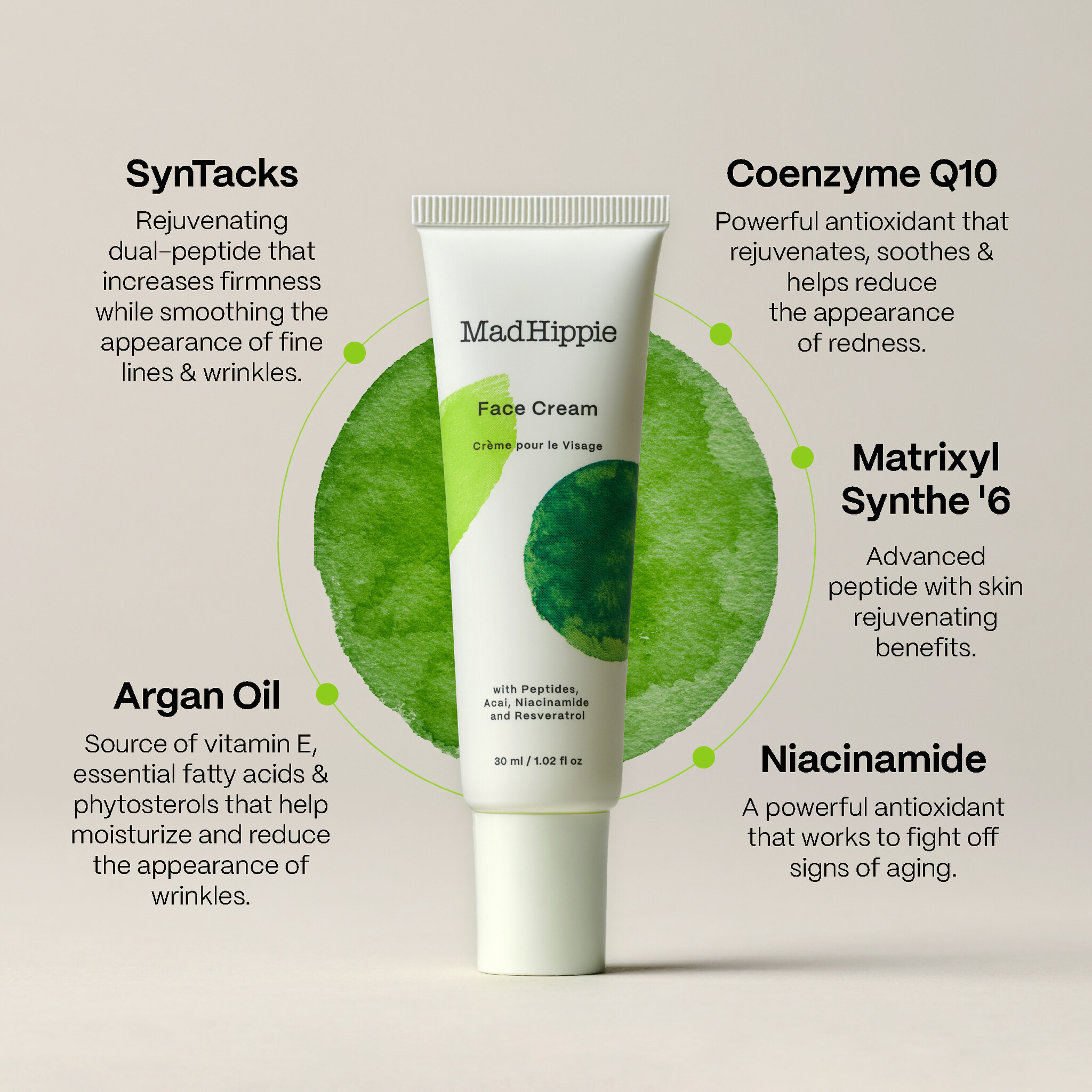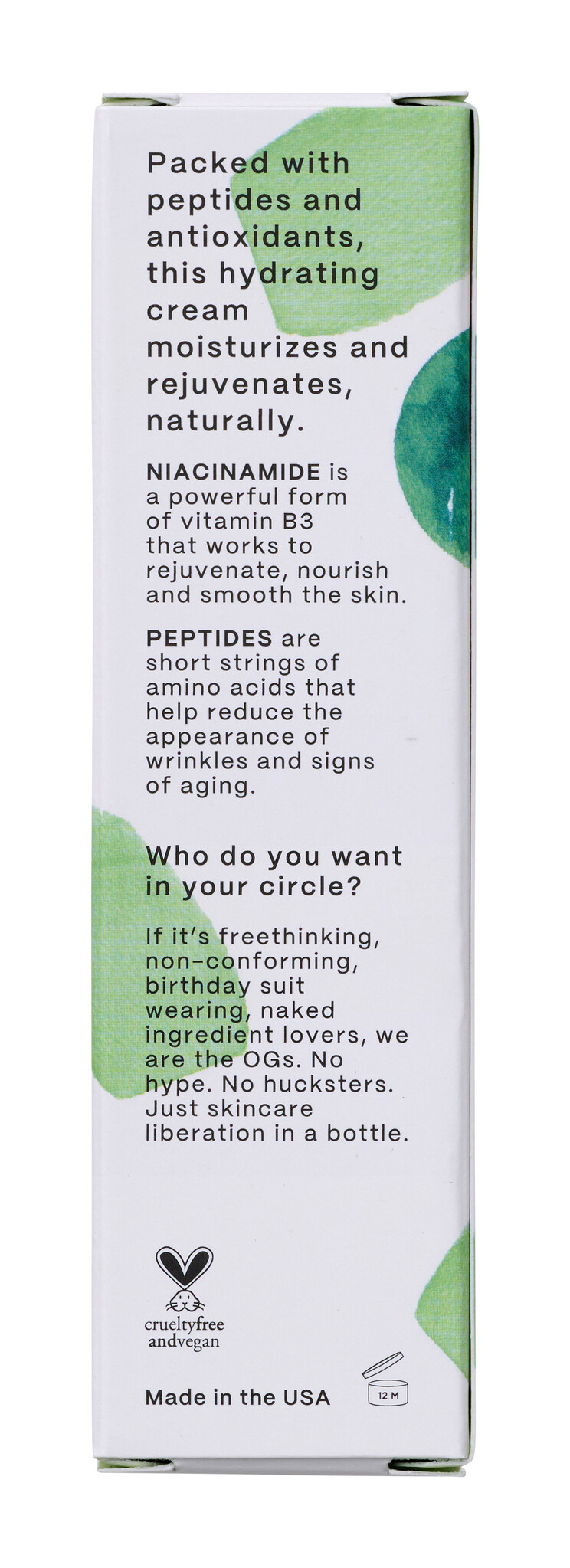 Onze gezichtscrème zit boordevol peptiden en antioxidanten, waaronder niacinamide en Acai, en is een lichte, gemakkelijk absorberende formule die de huid op natuurlijke wijze hydrateert, verzacht en verjongt!