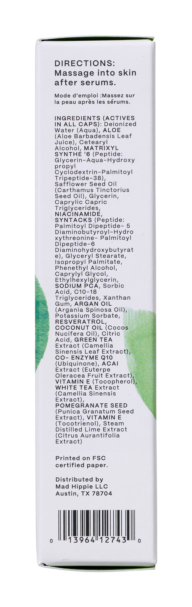 Water, Aloe (Aloe Barbadensis Leaf Juice), Cetearyl Alcohol, Matrixyl Synthe '6 (Peptide: Glycerin - Aqua - Hydroxypropyl Cyclodextrin - Palmitoyl Tripeptide-38), Safflower Seed Oil (Carthamus Tinctorius Seed Oil), Glycerin, Caprylic Capric Triglycerides, Niacinamide, Syntacks (Peptide: Palmitoyl Dipeptide-5 Diaminobutyroyl - Hydroxythreonine - Palmitoyl Dipeptide-6 Diaminohydroxybutyrate), Glyceryl Stearate, Isopropyl Palmitate, Phenethyl Alcohol, Caprylyl Glycol, Ethylhexyl Glycerin, Sodium PCA, Sorbic Acid, C10-18 Triglycerides, Xanthan Gum, Argan Oil (Argania Spinosa Oil), Potassium Sorbate, Resveratrol, Coconut Oil (Cocos Nucifera Oil), Citric acid, Green Tea Extract (Camellia sinensis Leaf Extract), Coenzyme Q10 (Ubiquinone), Acai Extract (Euterpe Oleracea Fruit Extract), Vitamin E (Tocopherol), White Tea Extract (Camellia Sinensis Extract), Pomegranate Seed (Punica Granatum Seed Extract), Vitamin E (Tocotrienol), Steam Distilled Lime Extract (Citrus Aurantifolia Extract)
