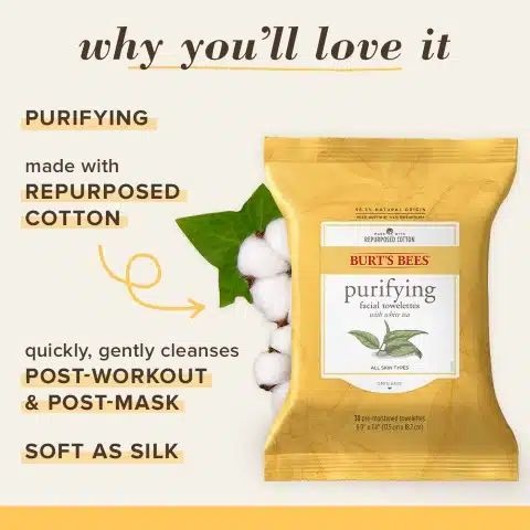 Burt´s Bees Facial Towelettes White Tea zijn gezichtsdoekjes, gemaakt van minimaal 60% hergebruikt katoen, om vuil en make-up in één beweging te verwijderen terwijl de huid wordt verzorgd. De gezichtsdoekjes zijn vooraf bevochtigd met voedingsrijke plantenextracten, waaronder zuiverende witte thee, en voelen zijdezacht aan. De huid wordt zacht, schoon en verfrist. Makkelijk voor onderweg!