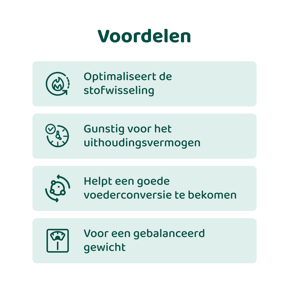 Samen vormen deze ingrediënten een doordachte aanvulling die kan helpen om jouw hond meer energie te geven, de stofwisseling te optimaliseren en in goede conditie te houden.