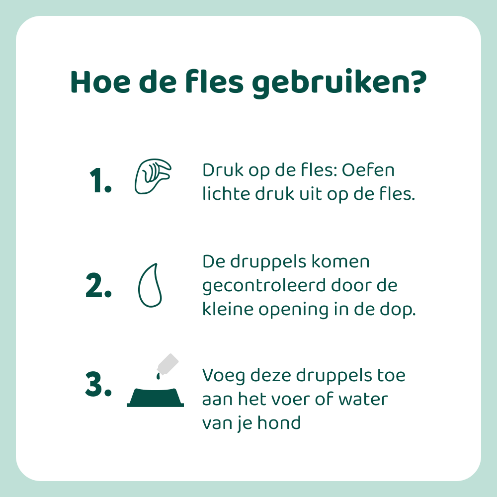 Ons Gezond Gewicht Support voeg je toe aan de voeding of het drinkwater van je hond. Het flesje heeft een eenvoudige doseerdop zodat de druppels makkelijk kunnen toegevoegd worden aan het voer of water.
