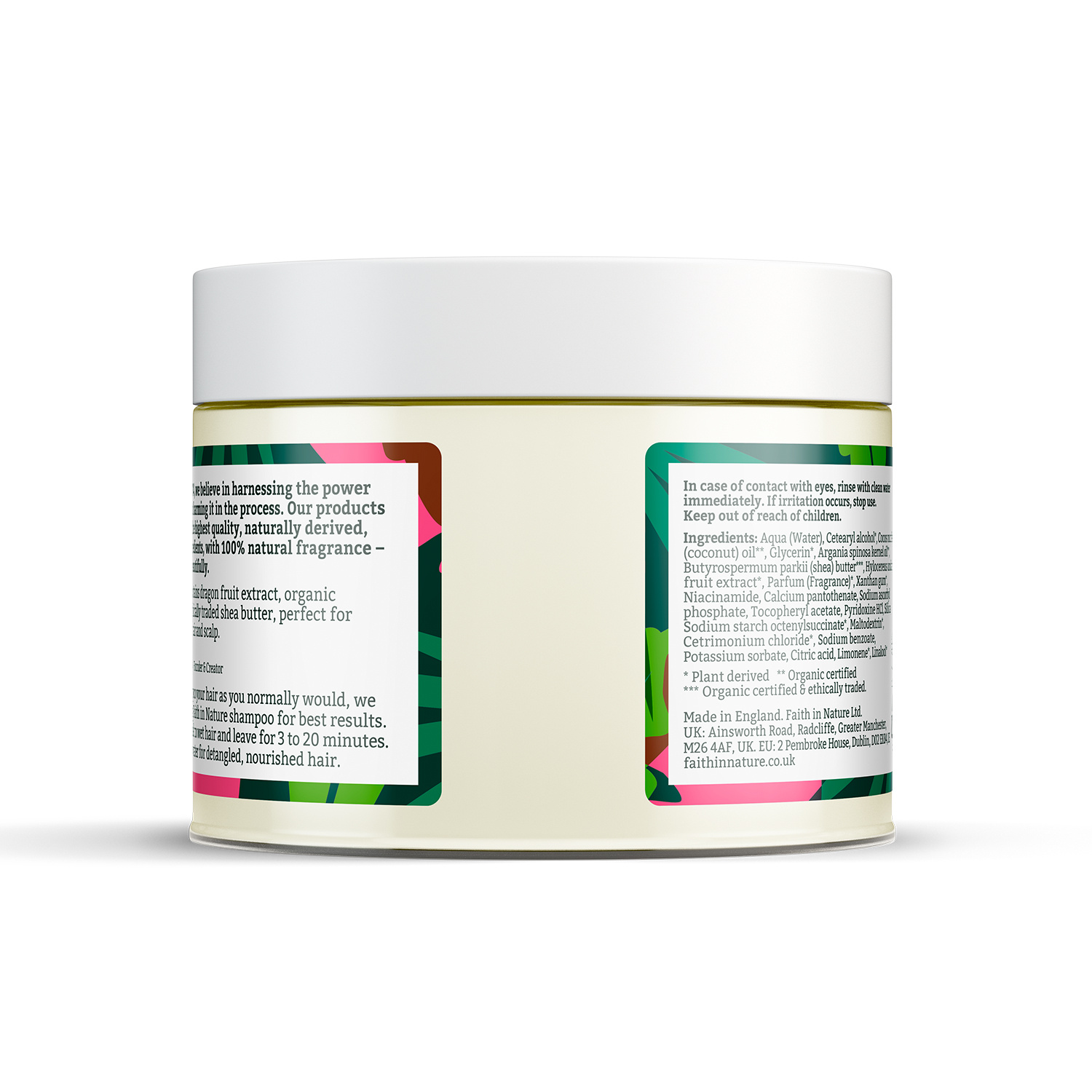 Na het wassen, breng je het masker aan op vochtig haar en laat je het 3-20 minuten op je haar inwerken, afhankelijk van de behandeling die je wenst. Goed uitspoelen met warm water totdat het er geen restjes overblijven. Voor het beste resultaat, gebruik met Faith in Nature Dragon Fruit Shampoo of Dragon Fruit Shampoo Bar voor ultieme revitalisatie van het haar. In geval van contact met de ogen, onmiddellijk uitspoelen met schoon water. Als irritatie optreedt, stoppen met gebruik. Buiten bereik van kinderen houden.