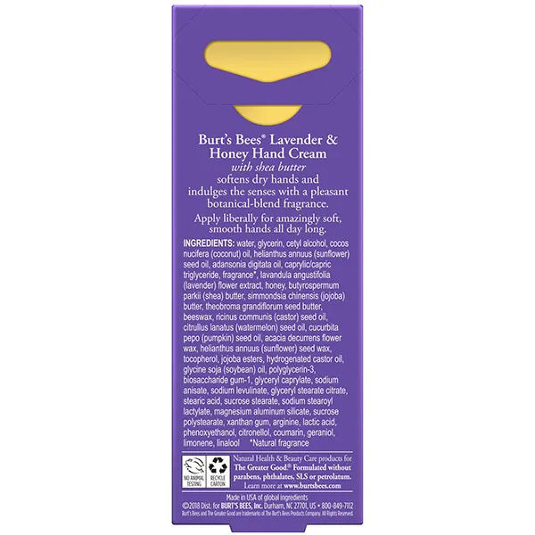 Burt’s Bees Hand Cream Lavender & Honey met Shea Butter hydrateert en verzacht droge handen en verwent de zintuigen met een botanische mix van lavendel en honing. Deze luxe handcrème voedt de handen met behulp van Shea Butter, Baobab- en pompoenzaadolie. De rijke boterachtige textuur maakt de huid van de handen soepel en geeft een zijdezacht gevoel met de ontspannende geur van lavendel en honing. Deze niet-vette formule is dermatologisch getest. De makkelijk knijpbare tube handcrème is handig van formaat voor in de handtas of om in de auto mee te nemen. Laat je handen zien wat liefde is!