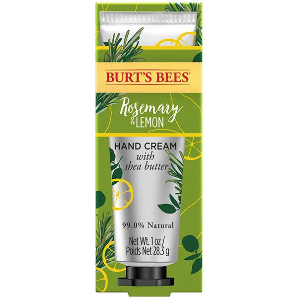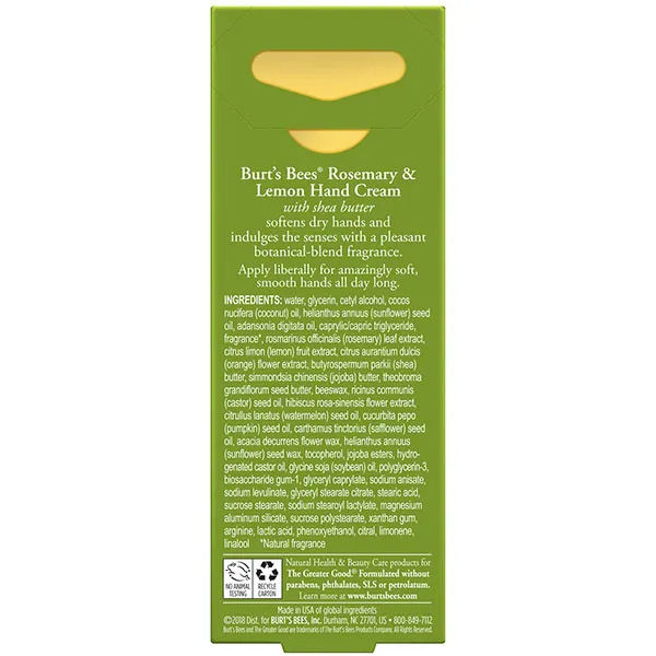 Burt’s Bees Hand Cream Rosemary & Lemon met Shea Butter verzacht droge handen en verwent de zintuigen met een botanische mix van rozemarijn en citroen. Deze luxe handcrème voedt de handen met behulp van Shea Butter, Baobab- en pompoenzaadolie. Deze rijke boterachtige textuur maakt de huid van de handen soepel en geeft een zijdezacht gevoel met de verfrissende geur van rozemarijn en citroen. Deze niet-vette formule is dermatologisch getest. De makkelijk knijpbare tube handcrème is handig van formaat voor in de handtas of om in de auto mee te nemen. Laat je handen zien wat liefde is!