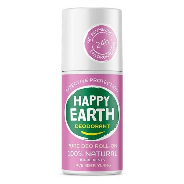 De Pure Deo Roll-On Lavender Ylang van Happy Earth is een 100% natuurlijke, 100% effectieve deodorant roller. De deodorant laat een microscopisch laagje van minerale zouten achter op de huid. Deze doden de bacteriën, zonder de poriën te blokkeren of te vernauwen. Hierdoor blijf je de hele dag fris ruiken. De deodorant laat geen witte of gele vlekken in kleding achter. Betaïne, aloë vera en etherische oliën van lavendel en bergamot verzorgen en verzachten de huid. De deodorant heeft een fris-vrolijke geur van lavendel en ylang.
