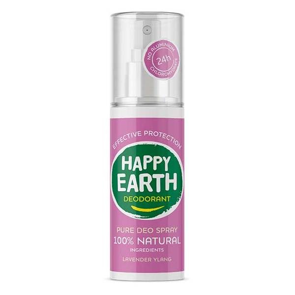 De Pure Deo Spray Lavender Ylang van Happy Earth is een 100% natuurlijke, 100% effectieve deodorant. De deodorant laat een microscopisch laagje van minerale zouten achter op de huid. Deze doden de bacteriën, zonder de poriën te blokkeren of te vernauwen. Hierdoor blijf je de hele dag fris ruiken. De deodorant laat geen witte of gele vlekken in kleding achter. Betaïne, aloë vera en etherische oliën van lavendel en bergamot verzorgen en verzachten de huid. De deodorant heeft een fris-vrolijke geur van lavendel en ylang.