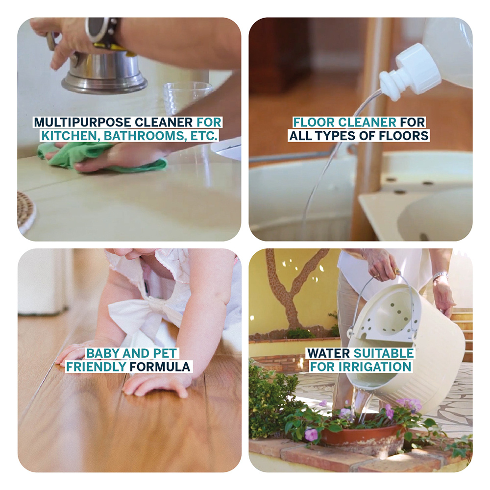 Het is geschikt voor alle oppervlakken (vloeren, keuken- en badkamermeubels, toiletten en betegelde oppervlakken), waardoor het niet nodig is verschillende schoonmaakproducten te kopen en te gebruiken.