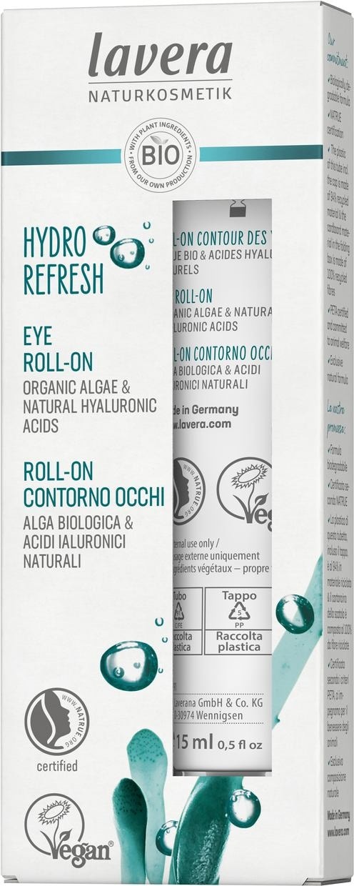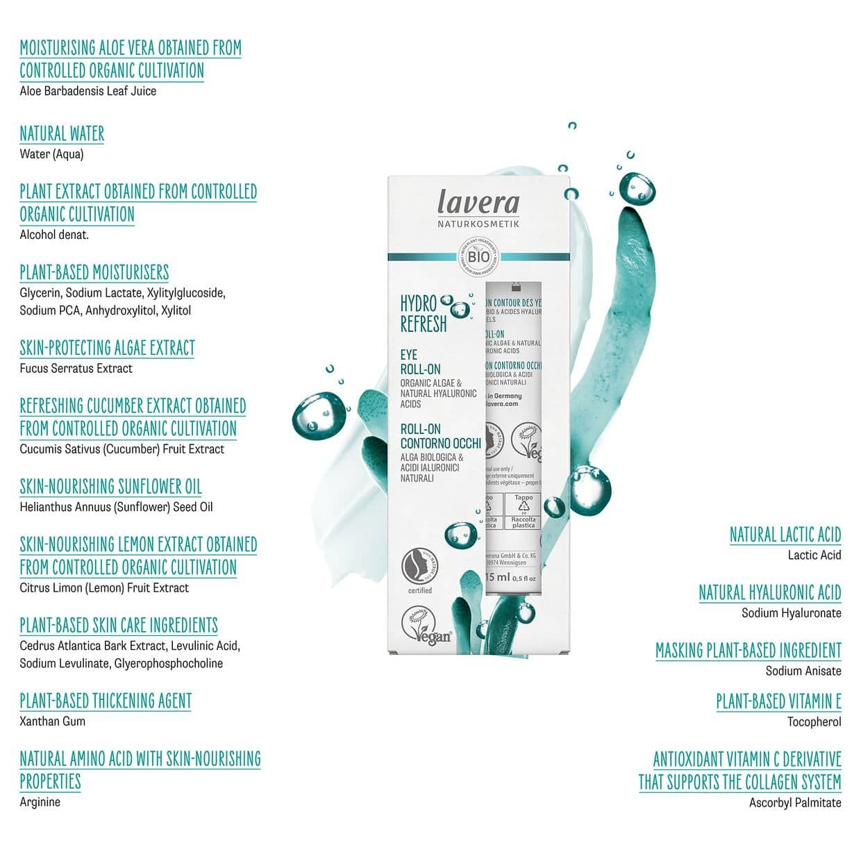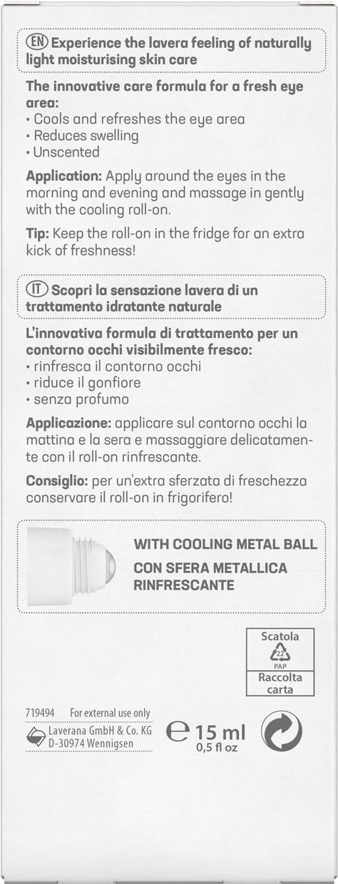 s Ochtends en 's avonds rond de ogen aanbrengen en zachtjes inmasseren met de verkoelende roll-on. Met verkoelende metalen bal. Gebruik voor een optimaal resultaat ook de andere producten uit onze lavera HYDRO Refresh verzorgingslijn.