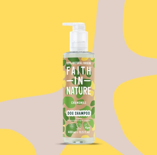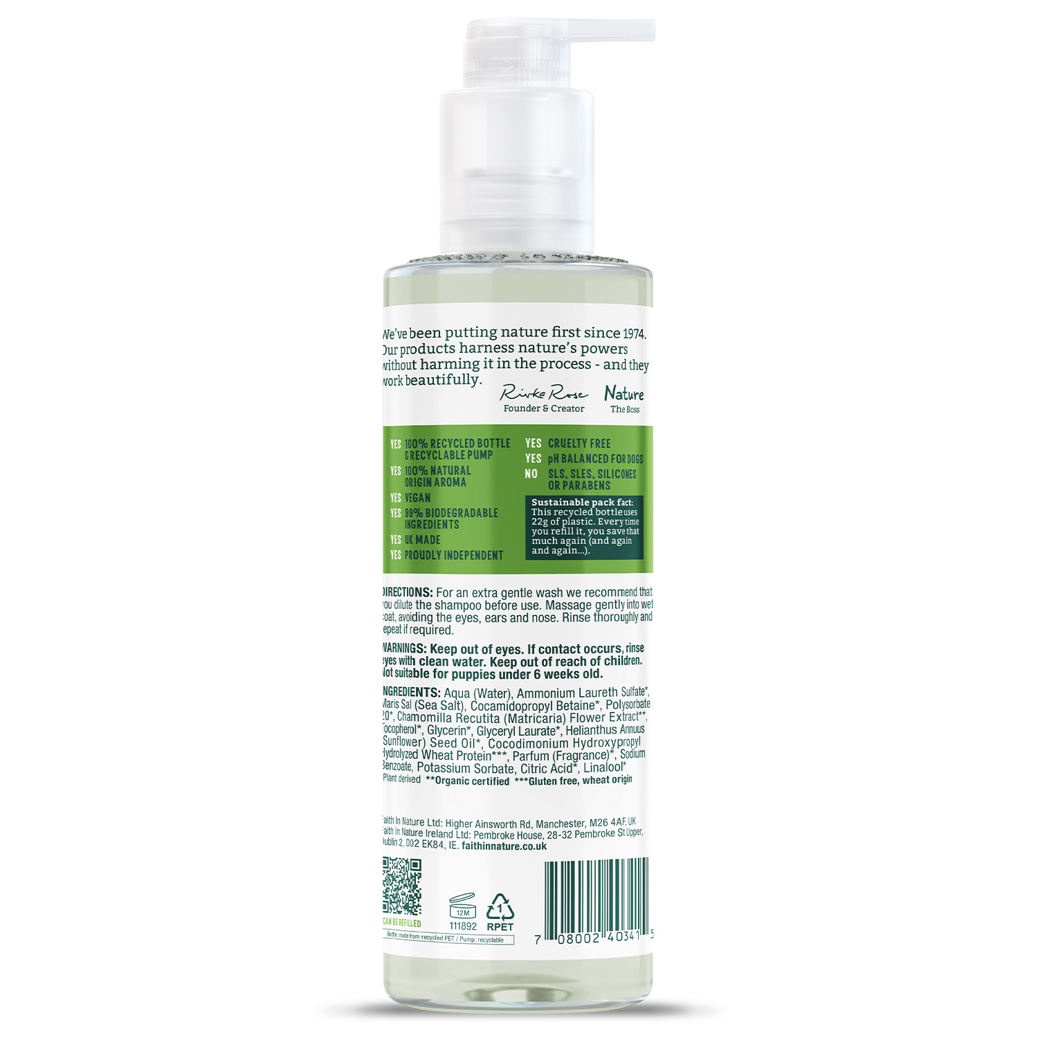 Faith in Nature Kamille Honden Shampoo bevat kalmerende kamille essentiële oliën om gevoelige honden en puppies zacht te reinigen.