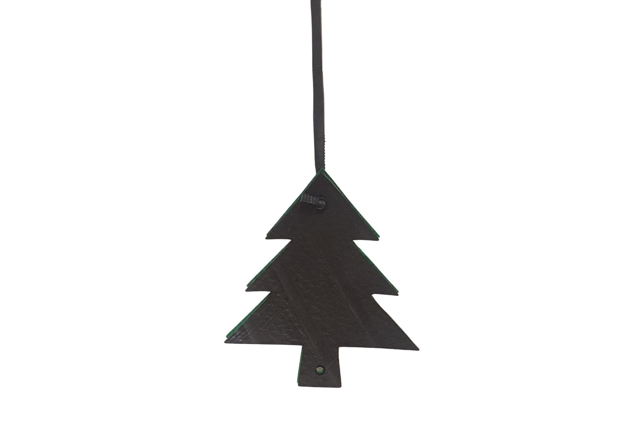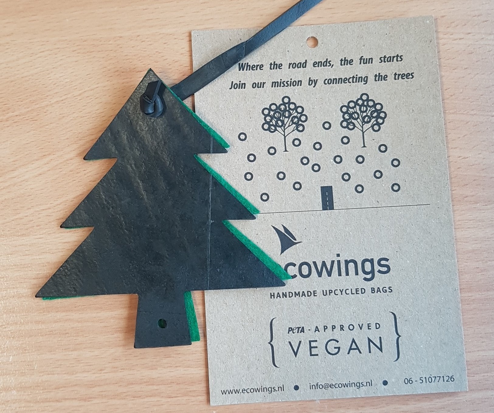 Deze leuke kersthanger is met de hand gemaakt van resten binnenband van vrachtauto’s en een achterkant van groen vilt. De kersthanger hangt aan een soepel rubberen koord van binnenband.
