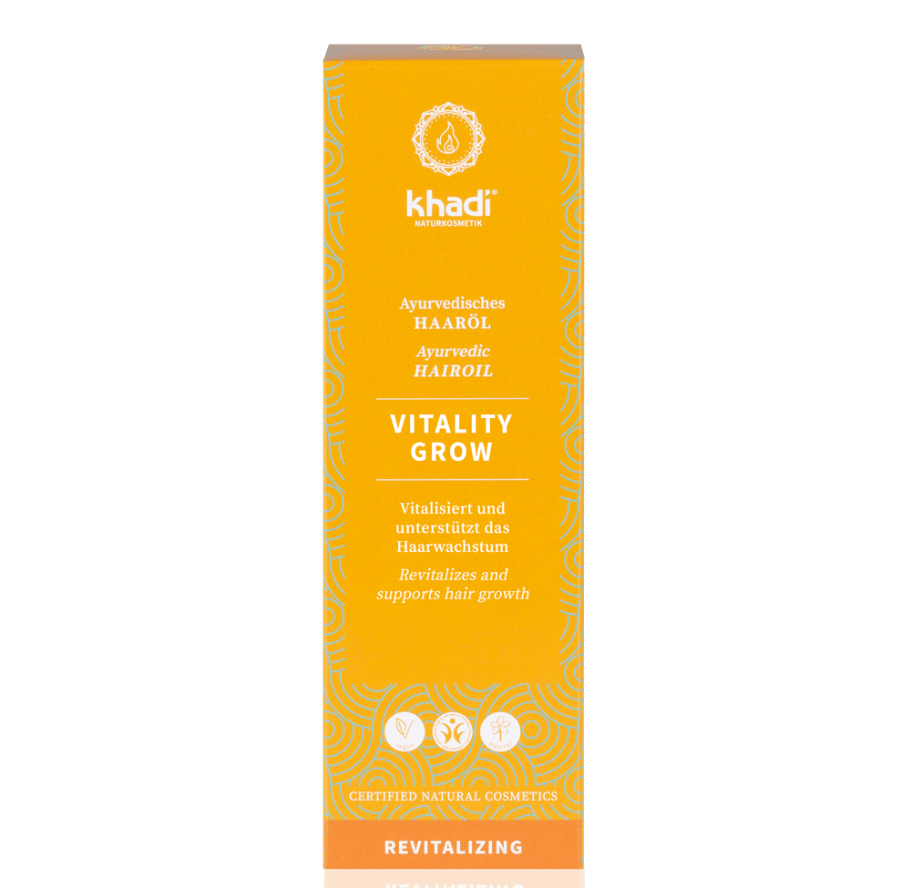 De Ayurvedic Hair Oil Vitality Grow van Khadi is een natuurlijke hoofdhuid- en haarolie voor merkbaar meer vitaliteit, een gerevitaliseerde hoofdhuid en dikkere haargroei. De haarolie is pure levensenergie voor het haar: het verzorgt de hoofdhuid met voedingsstoffen, versterkt de haarwortels en stimuleert de haargroei. Geniet van vol, gezond haar, want een gezonde hoofdhuid is een essentieel voor mooi haar. Het geheim van de Vitality Grow haarolie is de magische werking van de Khadi elixir: geselecteerde Indiase geneeskrachtige planten worden traditioneel voorzichtig boven een open vuur gekookt volgens ayurvedische recepten van duizenden jaren oud. Dit geneeskrachtige kruidenextract stimuleert de doorbloeding en de stofwisseling van de hoofdhuid en activeert zo de haargroei. Ayurvedische geneeskrachtige planten waaronder rozemarijn en fenegriek werken vitaliserend en bevorderen de haargroei. Bhringaraj geeft je haar een levendige elasticiteit en voorkomt gespleten haarpunten. In de ayurveda wordt hoofdhuid- en haarolie gebruikt als een intensieve, herstellende haarverzorging omdat het het haar van binnenuit opbouwt. Het haar ziet er niet alleen goed verzorgt uit, het ontvouwt ook haar natuurlijke kracht en gezonde schoonheid. De Ayurvedic Hair Oil Vitality Grow is vegan en 100% natuurlijk.