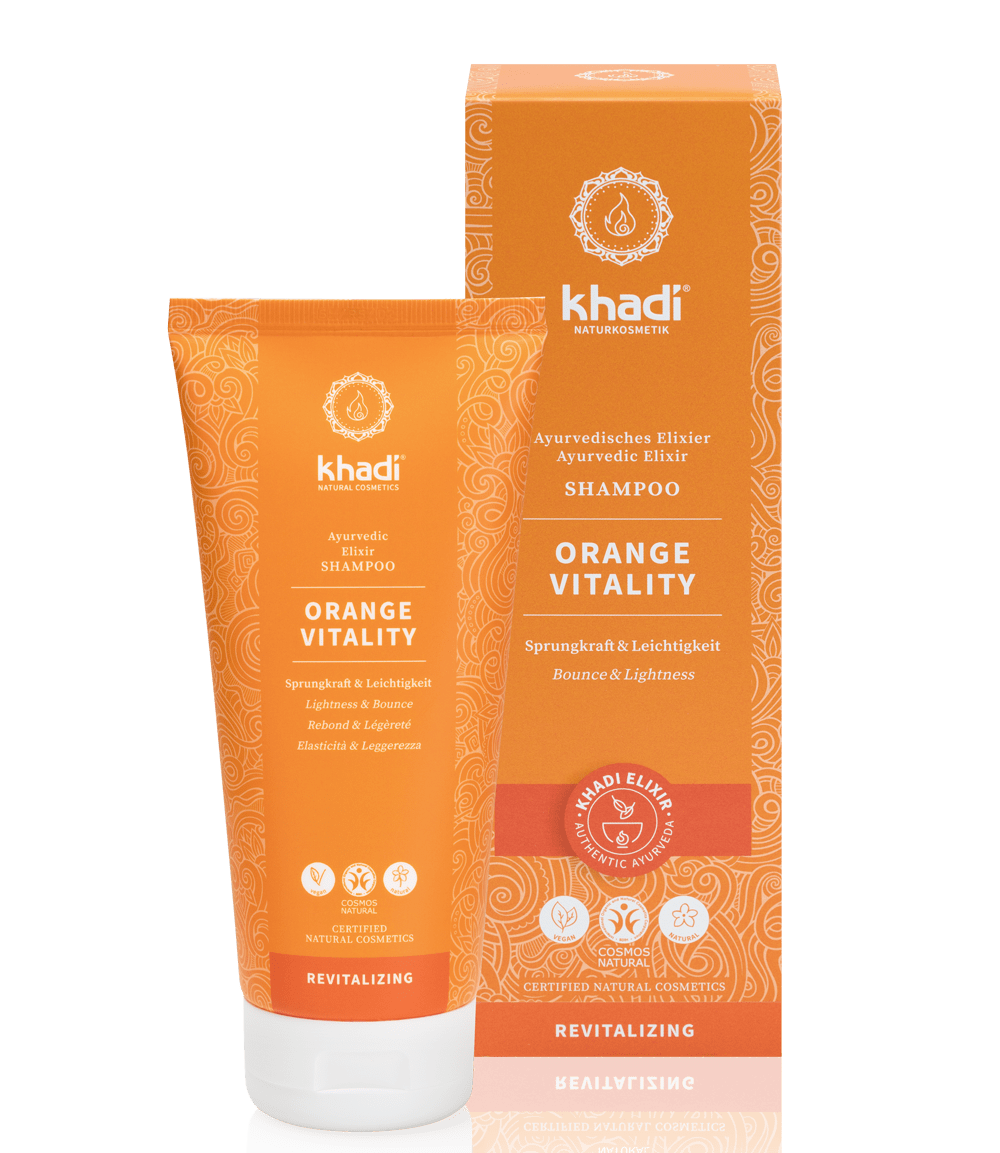 De Orange Vitality Ayurvedic Elixir Shampoo van Khadi is een natuurlijke shampoo die je haar levendige lichtheid, vitaliserende frisheid en natuurlijke veerkracht geeft. Deze ayurvedische shampoo is een verfrissende boost voor vermoeid en snel vet wordend haar. Het geheim van de vitaliserende werking en lichtheid is te danken aan de Orange Vitality Elixer. In dit ayurvedische plantenextract verenigt zich de individuele werkzaamheid van handgeplukte Indiase geneeskrachtige kruiden tot een geheel. De elixer wordt zorgvuldig geproduceerd boven een open vuur volgens traditionele ayurvedische recepten.