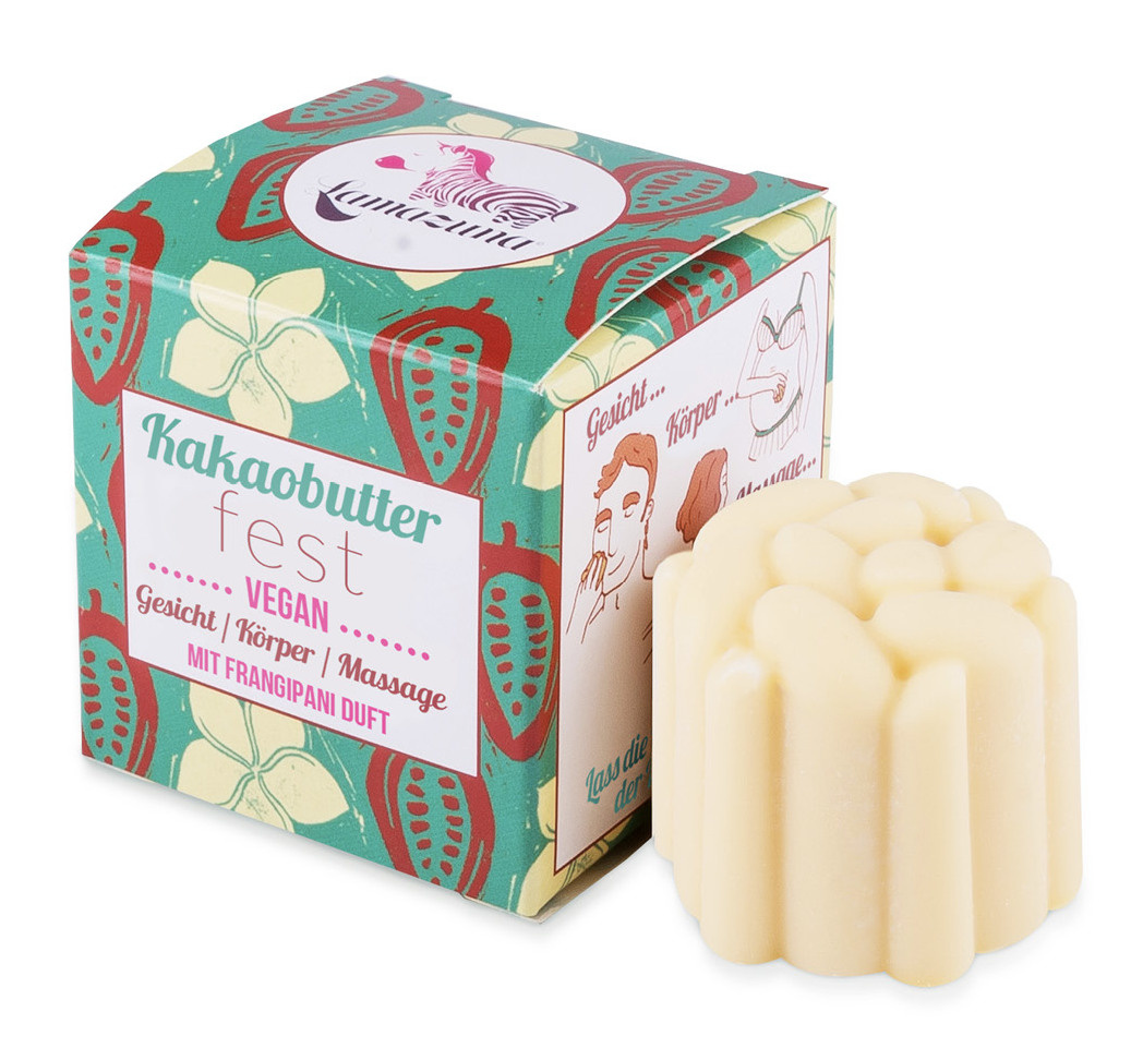 De Vaste Cacaoboter van Lamazuna biedt je hud een extra portie verzorging. Deze heerlijk geurende cacaoboter is een intens hydraterende, beschermende en voedende verzorging voor een onweerstaanbaar zacht huidgevoel. Ideaal voor de droge en gestreste huid. Geschikt voor de verzorging van gezicht en lichaam, maar kan ook in plaats van massageolie worden gebruikt. De Vaste Cacaoboter bestaat uit biologische cacaoboter, biologische baobabolie en biologische kokosolie die langzaam smelten zodra ze in contact komen met de warmte van je huid. Verrijkt met de heerlijke geur van frangipani. De Vaste Cacaoboter is plasticvrij verpakt en 100% vegan.
