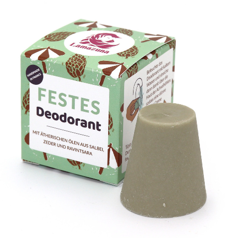 De Vaste Deodorant Salie, Ceder & Ravintsara van Lamazuna is een effectieve, natuurlijke deodorant zonder aluminiumzouten. Doordat de deodorant geen etherische oliën of natriumbicarbonaat bevat, is deze deo ideaal voor de gevoelige huid. Kokosolie werkt antibacterieel, zodat de zweetvorming niet onderdrukt wordt, maar de geurvormende bacteriën worden tegengegaan. Op deze manier worden onaangename geuren geheel natuurlijk verhinderd. Natriumbicarbonaat, kaolien klei, montmorilloniet klei en illiet klei ondersteunen de deodoriserende werking van de kokosolie. Etherische oliën van salie, ceder en ravintsara werken antibacterieel en geven de deo een fris-kruidige geur. De vaste deodorant is erg gemakkelijk in gebruik. Niet alleen is deze deo zeer milieuvriendelijk, hij gaat ook twee keer zo lang mee als een vloeibare deodorant. De Vaste Deodorant Salie, Ceder & Ravintsara is handgemaakt in Frankrijk, plasticvrij verpakt en 100% vegan.