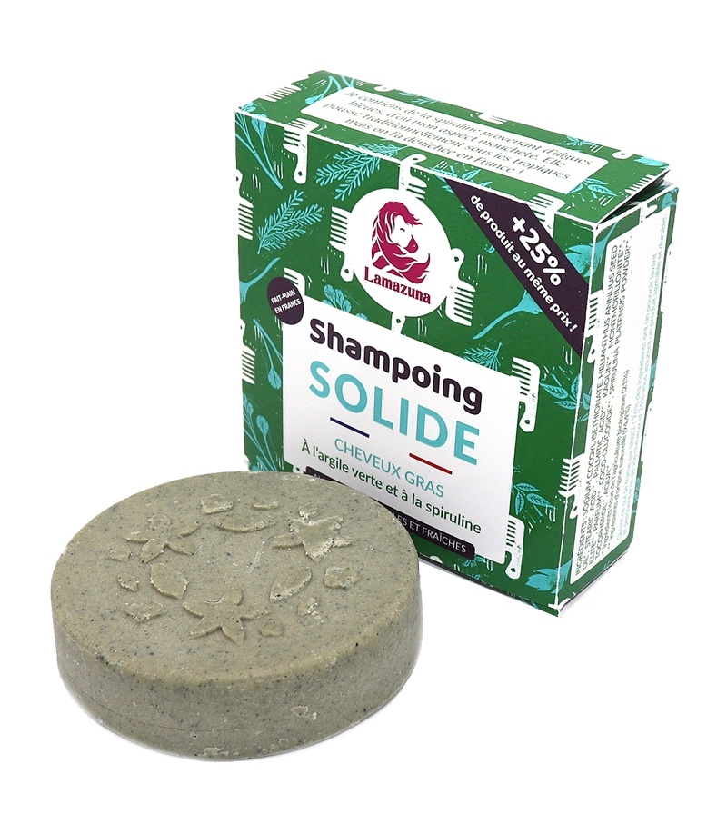 De Vaste Shampoo Vet Haar van Lamazuna is een duurzame natuurlijke shampoo voor vet haar. De shampoo zorgt voor zacht, licht en soepel haar en geeft glans. Maakt het haar makkelijk kambaar. Milde tensiden zorgen voor een milde reiniging zonder te irriteren of uit te drogen. Groene klei reinigt het haar en voorkomt dat het haar snel vet wordt. Spirulina versterkt het haar door de synthese van keratine te stimuleren. Zonnebloemolie hydrateert, beschermt en voorkomt droog, broos en pluizend haar. De Vaste Shampoo is 100% vegan en natuurlijk en is vrij van sulfaten.