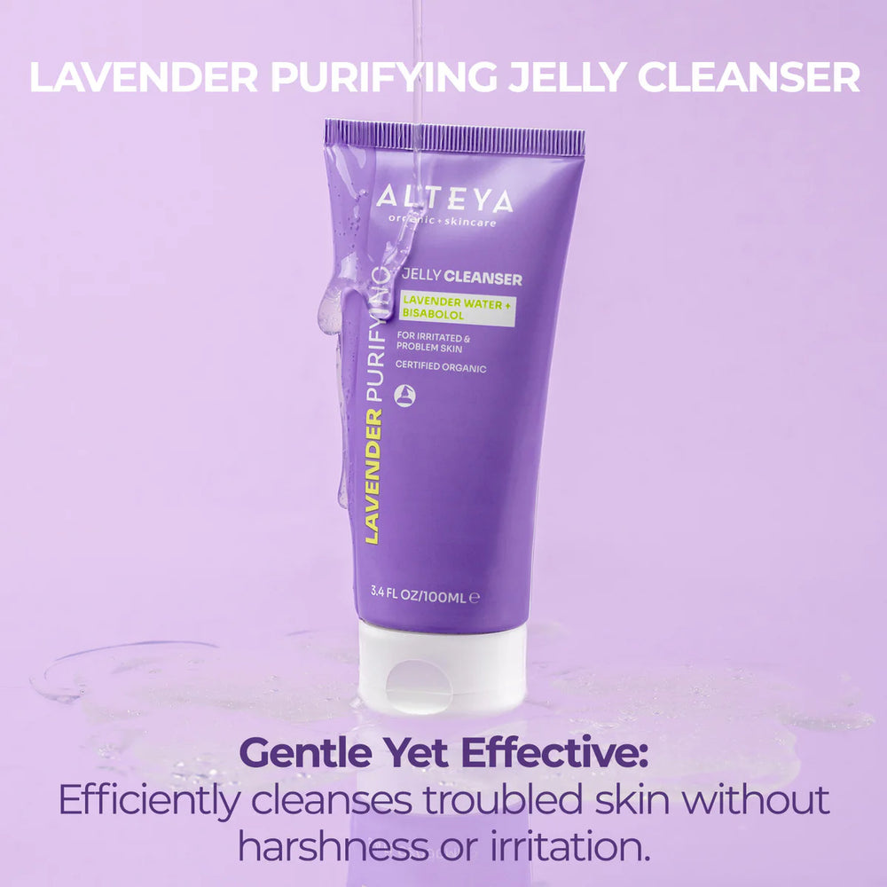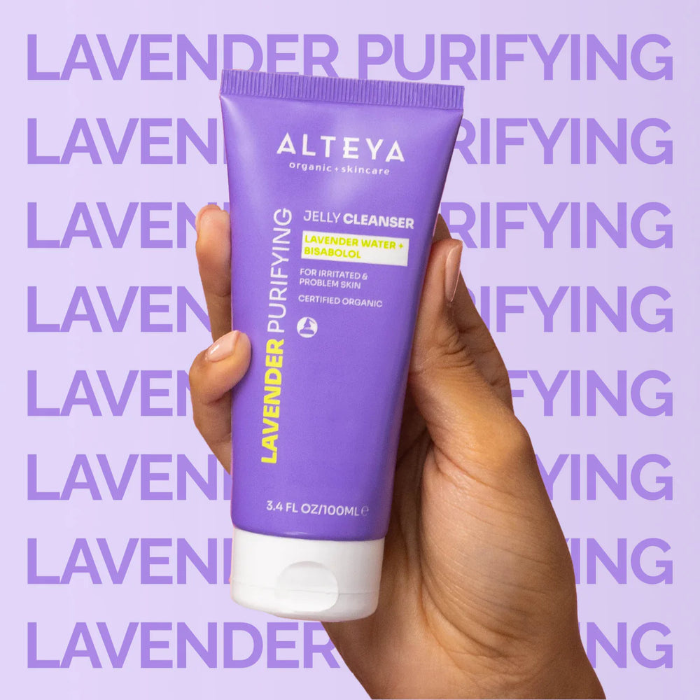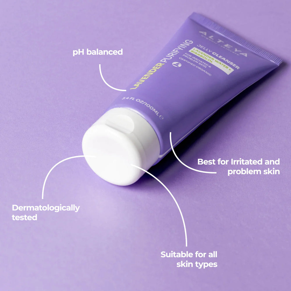 Lavendel Purifying Jelly Cleanser met biologisch lavendelwater en bisabolol om de huid te zuiveren, poriën te verkleinen en de huid te kalmeren.