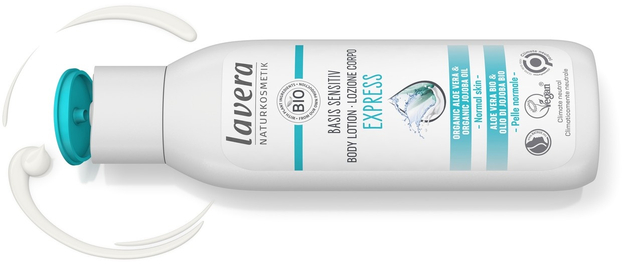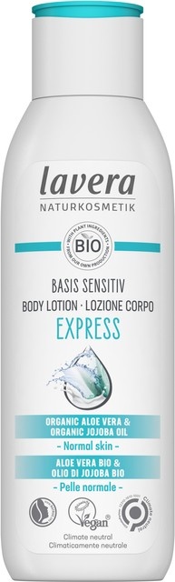 De Basis Sensitiv Body Lotion Express van Lavera is een natuurlijke bodylotion die 24 uur lang snel intrekkende hydratatie biedt voor de normale huid. De milde formule met biologische aloë vera en biologische jojoba olie biedt intensieve hydratatie en langdurige verzorging voor jouw huid. Biologische aloë vera is een echt multitalent, het bevat een veelvoud aan verschillende werkzame stoffen en staat bekend om haar hydraterende werking. Biologische jojoba olie trekt snel in, zorgt voor een zijdezachte huid en beschermt voor vochtverlies. Bevat verder o.a. biologische soja olie, biologisch citroenmelisse extract en biologisch calendula extract.