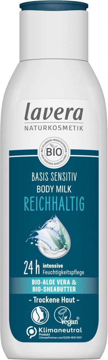 De Basis Sensitiv Body Lotion Rich van Lavera is een natuurlijke bodylotion die 24 uur lang intensieve hydratatie biedt voor de droge huid. De milde formule met biologische aloë vera en biologische shea butter hydrateert en voedt de droge huid intensief en beschermt voor uitdrogen. Biologische aloë vera is een echt multitalent, het bevat een veelvoud aan verschillende werkzame stoffen en staat bekend om haar hydraterende werking. Biologische shea butter bevat veel waardevolle stoffen, waaronder vitamine E, en verzorgt de droge huid intensief. Bevat verder o.a. biologische soja olie, biologisch melisse extract, biologisch calendula extract en vitamine E. De Basis Sensitiv Body Lotion Rich zorgt voor een zachte en soepel huid.