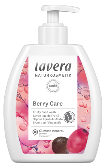 De Berry Care Hand Wash van Lavera is een milde, natuurlijke handzeep met verzorgende ingrediënten. Milde tensiden zorgen voor een zachte reiniging zonder de huid uit te drogen of te irriteren. Verrijkt met biologisch aloë vera sap, zeezout en biologische extracten van açai bes, chiazaad, goji bes en granaatappel om de huid te verzorgen, verzachten en kalmeren. De pH-huidneutrale formule met een zacht schuim geeft de handen een verzorgt huidgevoel. De Berry Care Hand Wash heeft een fruitig-frisse geur.